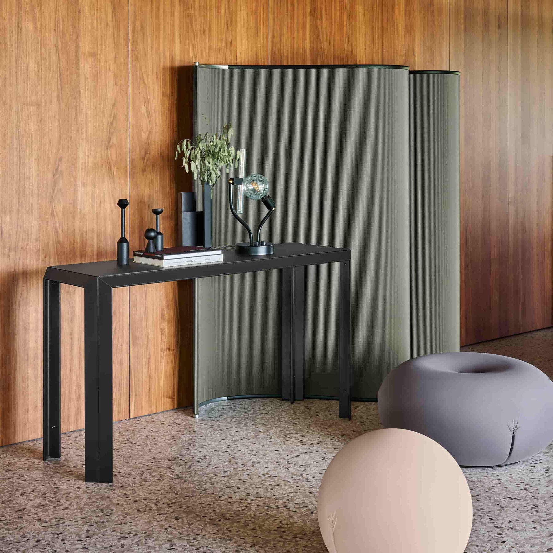 The T-TABLE rectangular console is built with a painted aluminium frame that can be completely disassembled and recycled.