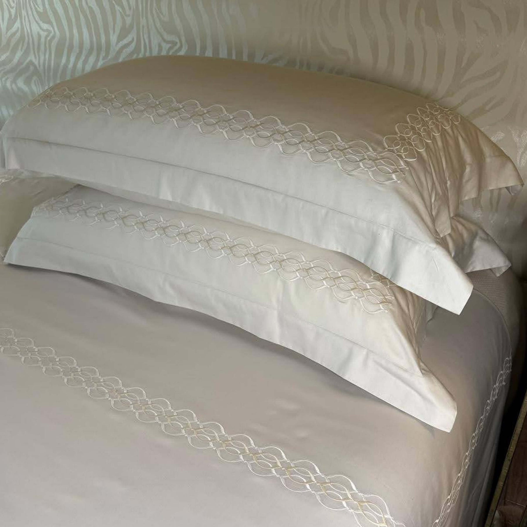 The OVAL CHAIN Embroidery features a sophisticated variation of the classic chain, showcasing Cittadini's timeless design. Each piece is meticulously embroidered on Egyptian cotton fabric, woven in Italy, to ensure the highest quality. The embroidery thread is mercerised, and the sheets are finished with a straight flange and mitred corners.