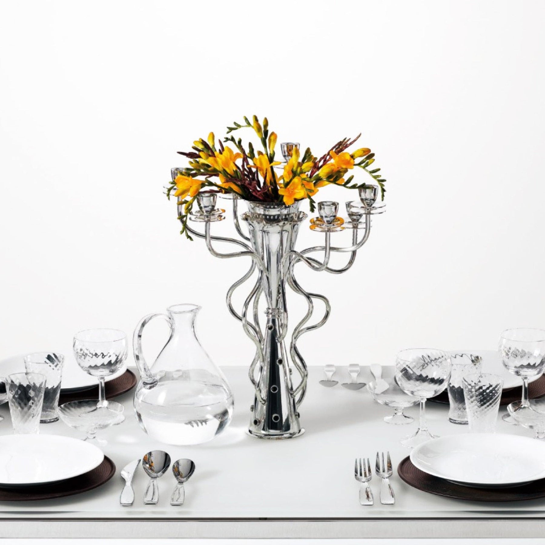 The silver-plated brass seven-branched candleholder SIMON, designed by Borek Sipek and crafted in Italy by Driade, features seven elegantly curved branches that resemble shoots of a wild plant—exemplifying art inspired by nature.