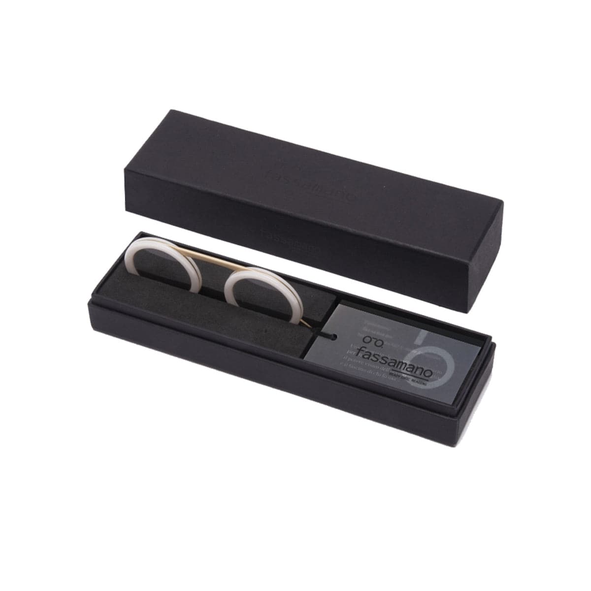 Corrective lenses, ranging from a strength of +2.00 or +3.00, are included. Reading focus can vary based on distance from the eyes. Suitable for +1.00/+2.50 (+2.00 corrective lens) and +2.50/+3.50 (+3.00 corrective lens). Your trusted optician can also easily fit the frame with prescription lenses thanks to Fassamano's patented rim closure.