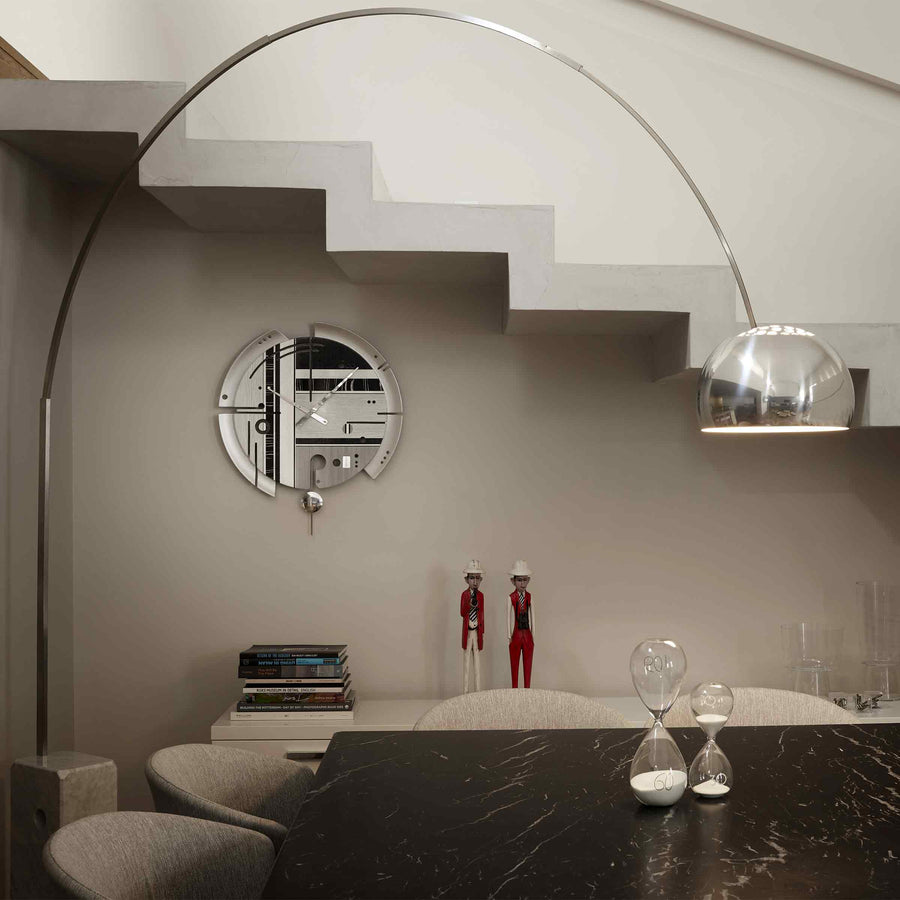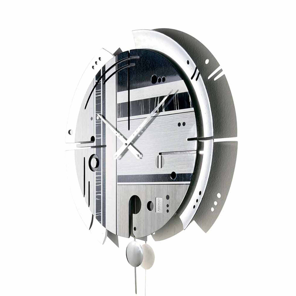 Chic and elegant wall clock SAMADA Contrast was hand-carved in Italy and is veneered in various types of wood including grey durmast and black Zebrano. It has a bright and lustred finish and features a silver-plated border around part of the face and a silver-coloured pendulum hanging from the centre. Two simple metal hands mark the hour and minutes.