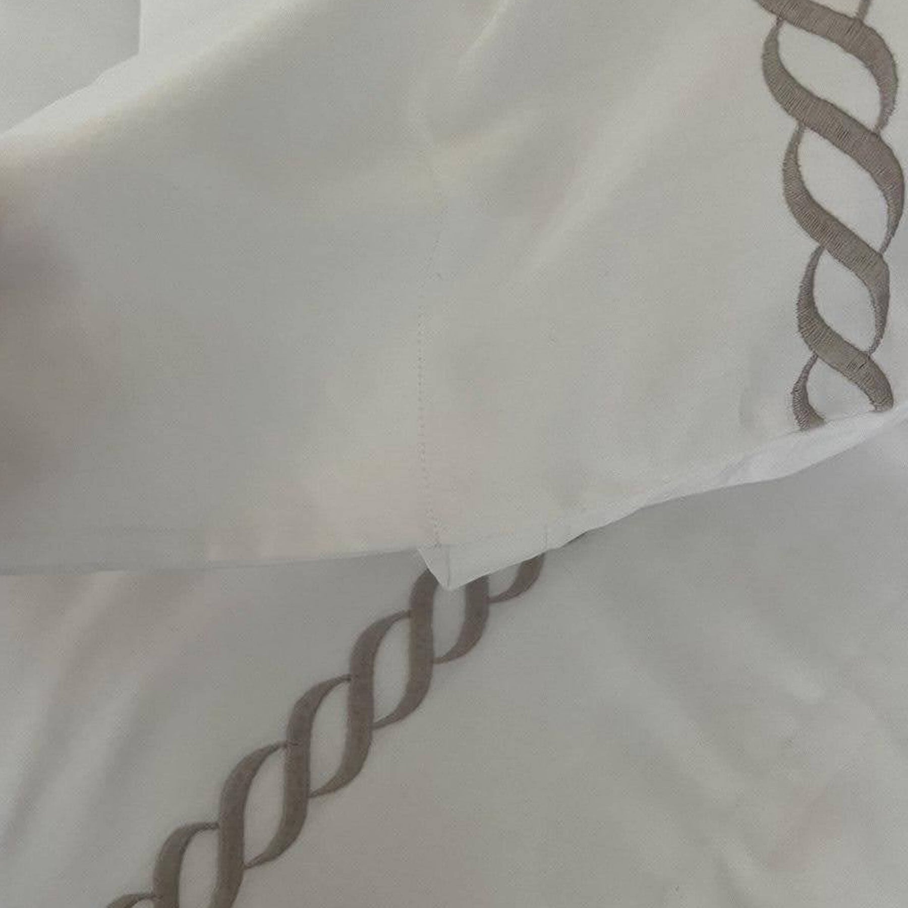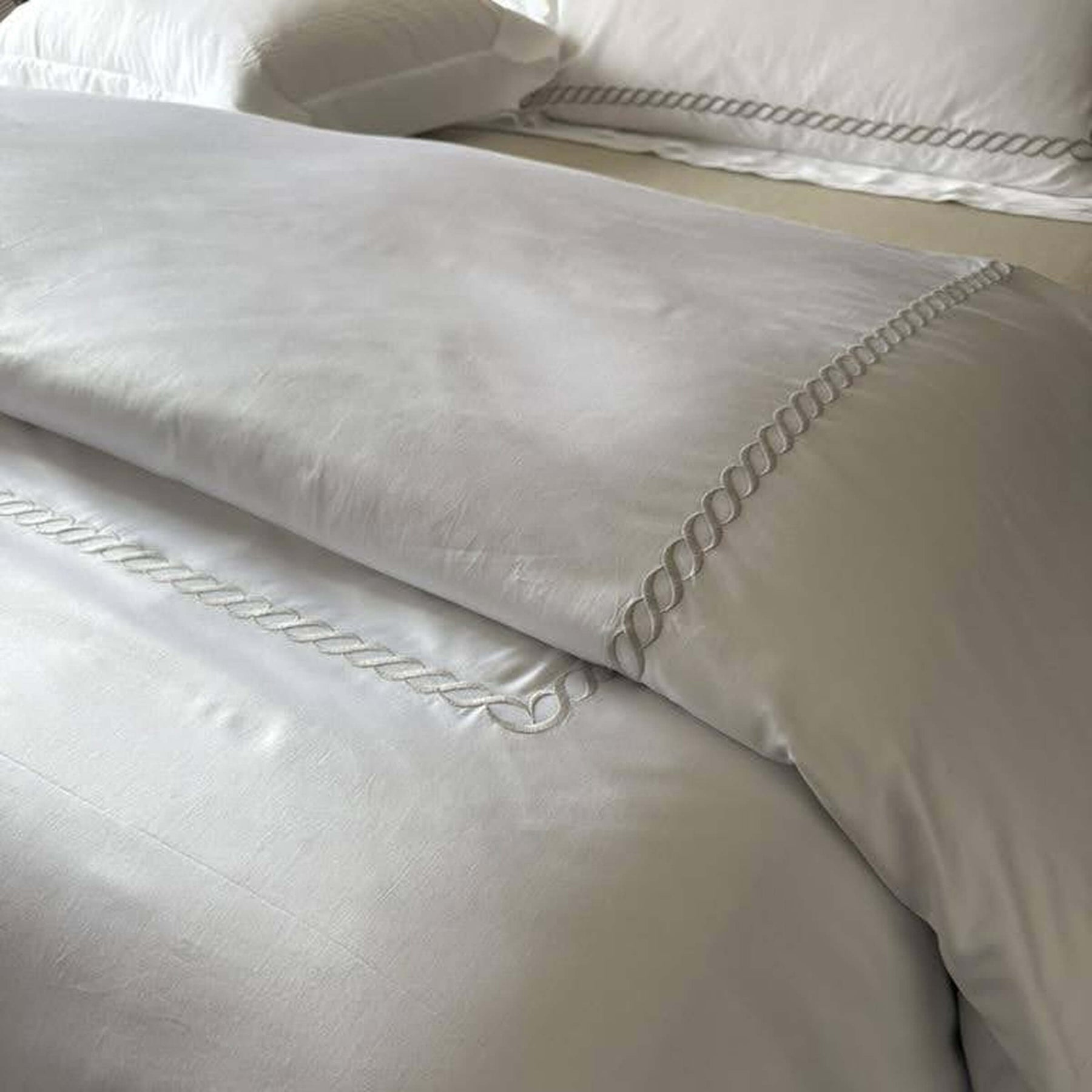 Die ESSE CHAIN Stickerei, ein zeitloses Design von Cittadini, zeichnet sich durch eine zart elegante dünne Linie in der Mitte aus, die sorgfältig auf ägyptischer Baumwolle, die in Italien gewebt wurde, gestickt ist. Der Stickfaden ist mercerisiert, und die Bettlaken sind exquisit mit einem geraden Saum und schräg angeschnittenen Ecken verarbeitet, was das höchste Niveau italienischer Handwerkskunst zeigt.