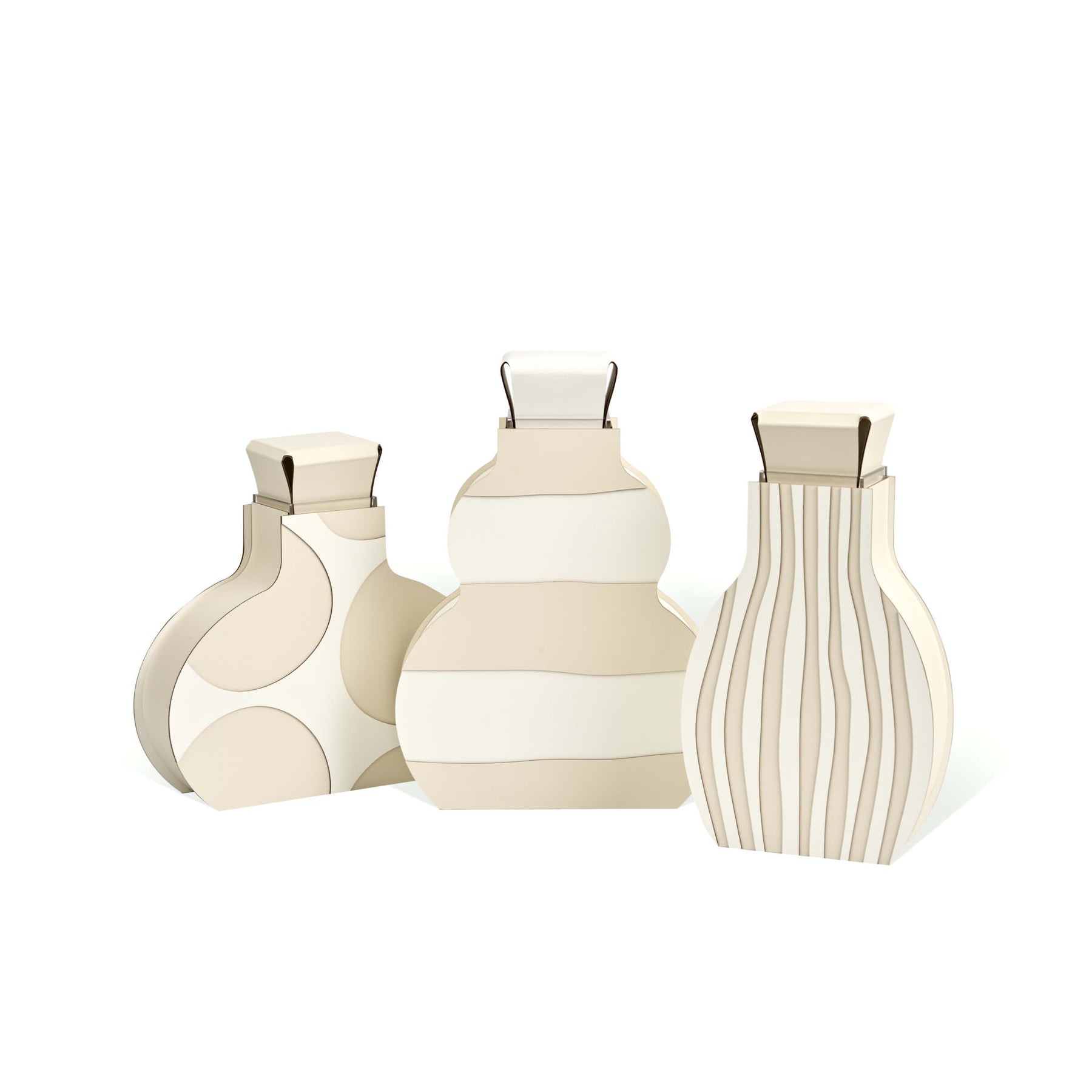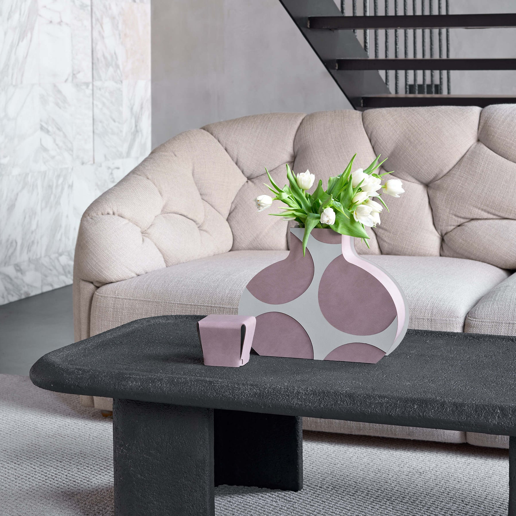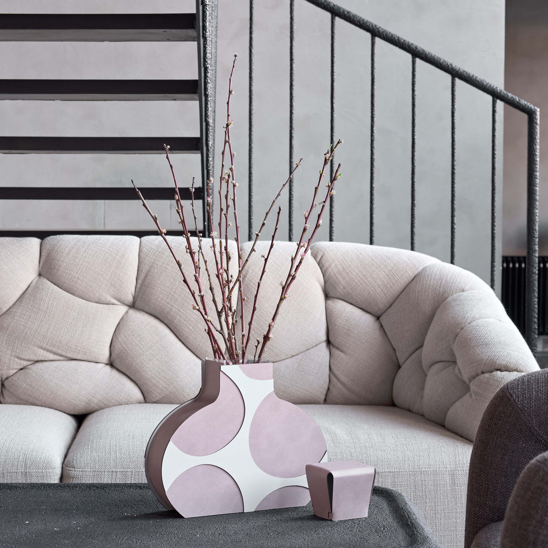 Erkennbar an ihren grafischen Elementen, zeichnen sich diese Vasen durch Formen mit Zeichen und bicolor Designs aus, die durch die haptische Qualität von zwei Lederschichten verstärkt werden. Folglich werden sie zu lebendigen Blickfängen in jeder Inneneinrichtung.
