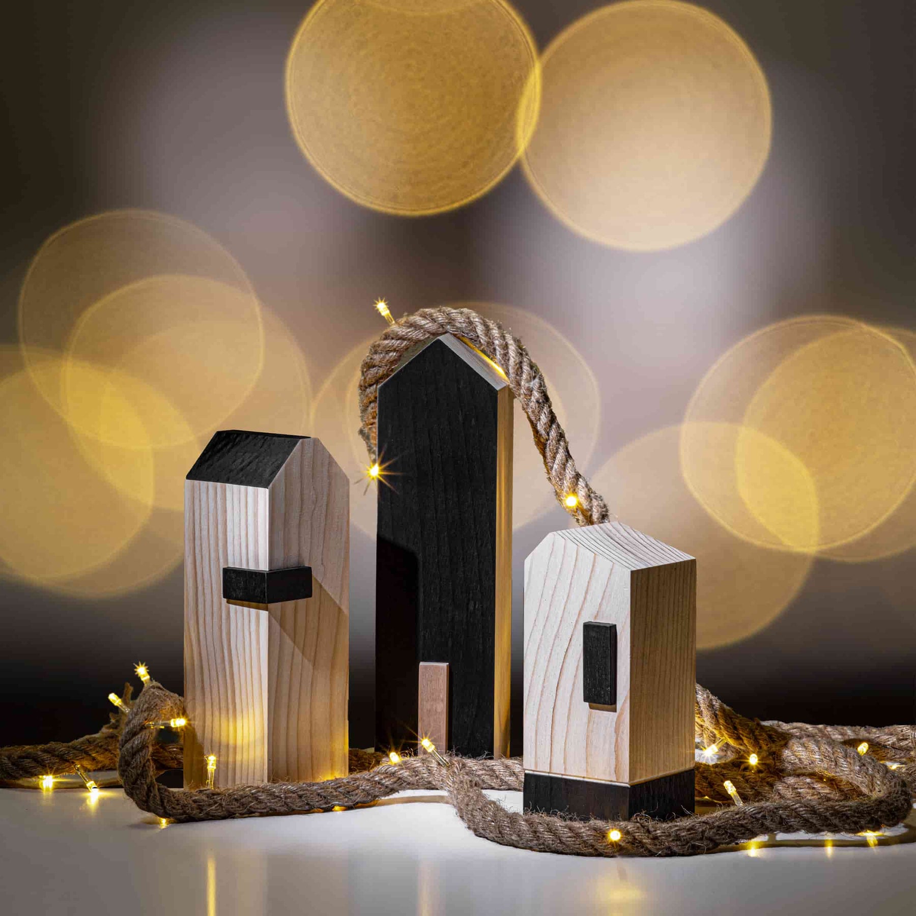 Inspiriert von nordischer Architektur, zollt diese Kollektion Rotterdam Tribut, insbesondere den ikonischen Häusern des Delfshaven-Viertels, neu interpretiert in einem schlanken, minimalistischen Stil. Neben den schönen Zedernhäusern umfasst die Kollektion drei stilisierte Tannenbäume, gefertigt aus natürlichem und Vulkan-Zedernholz, erhältlich in drei verschiedenen Höhen, passend für jeden Raum.