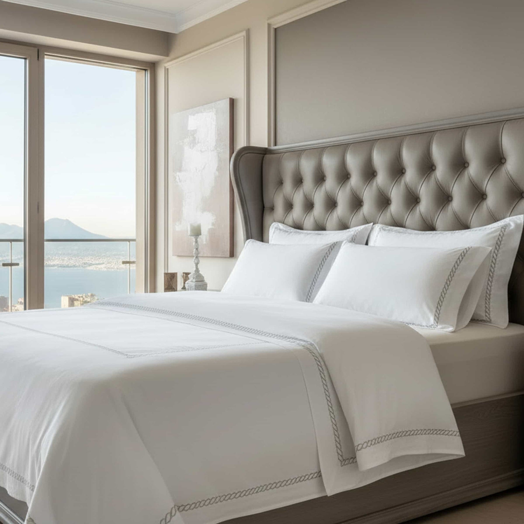 Das luxuriöse ägyptische Baumwoll-Bettlaken-Set ESSE CHAIN von Cittadini ist exquisit in Italien gefertigt.