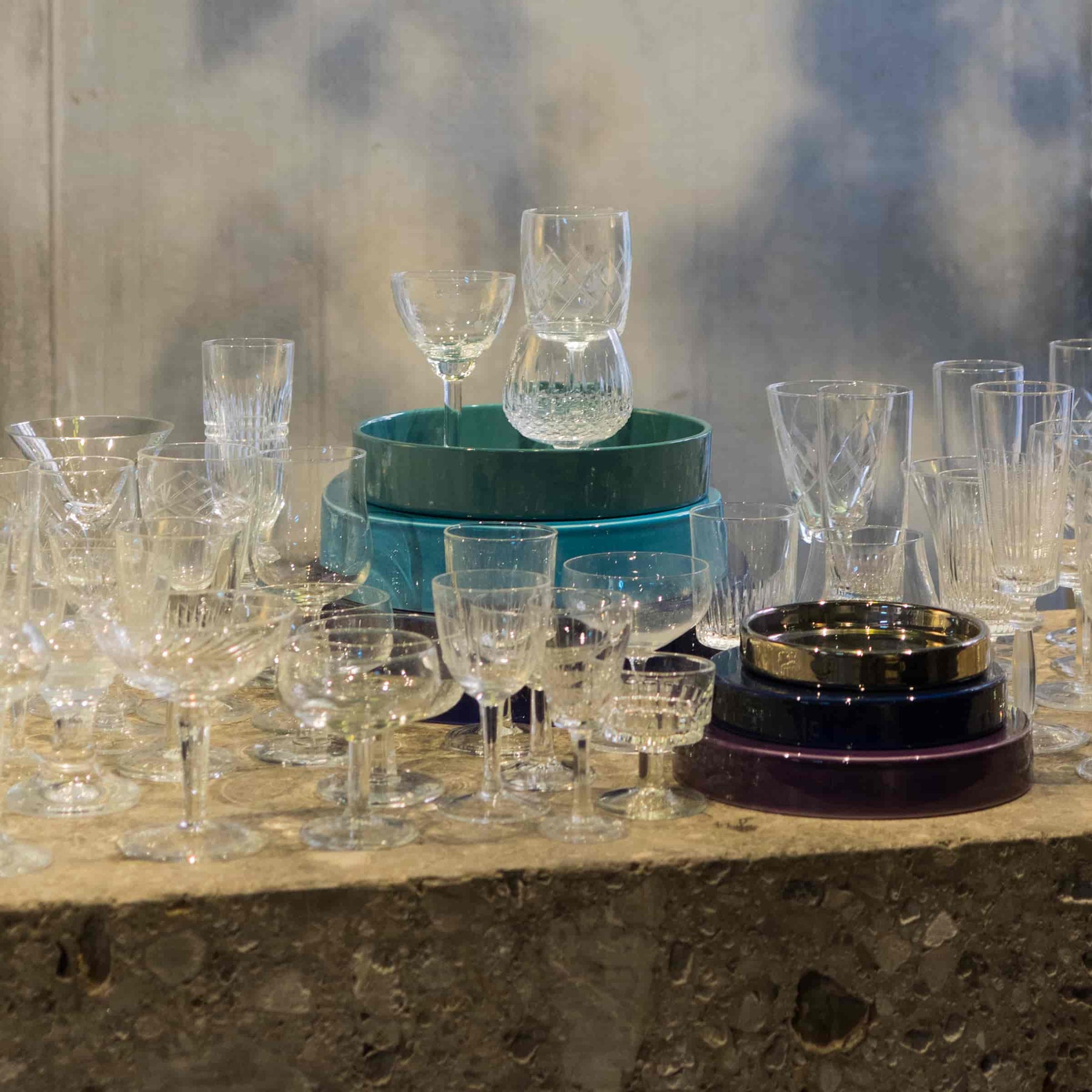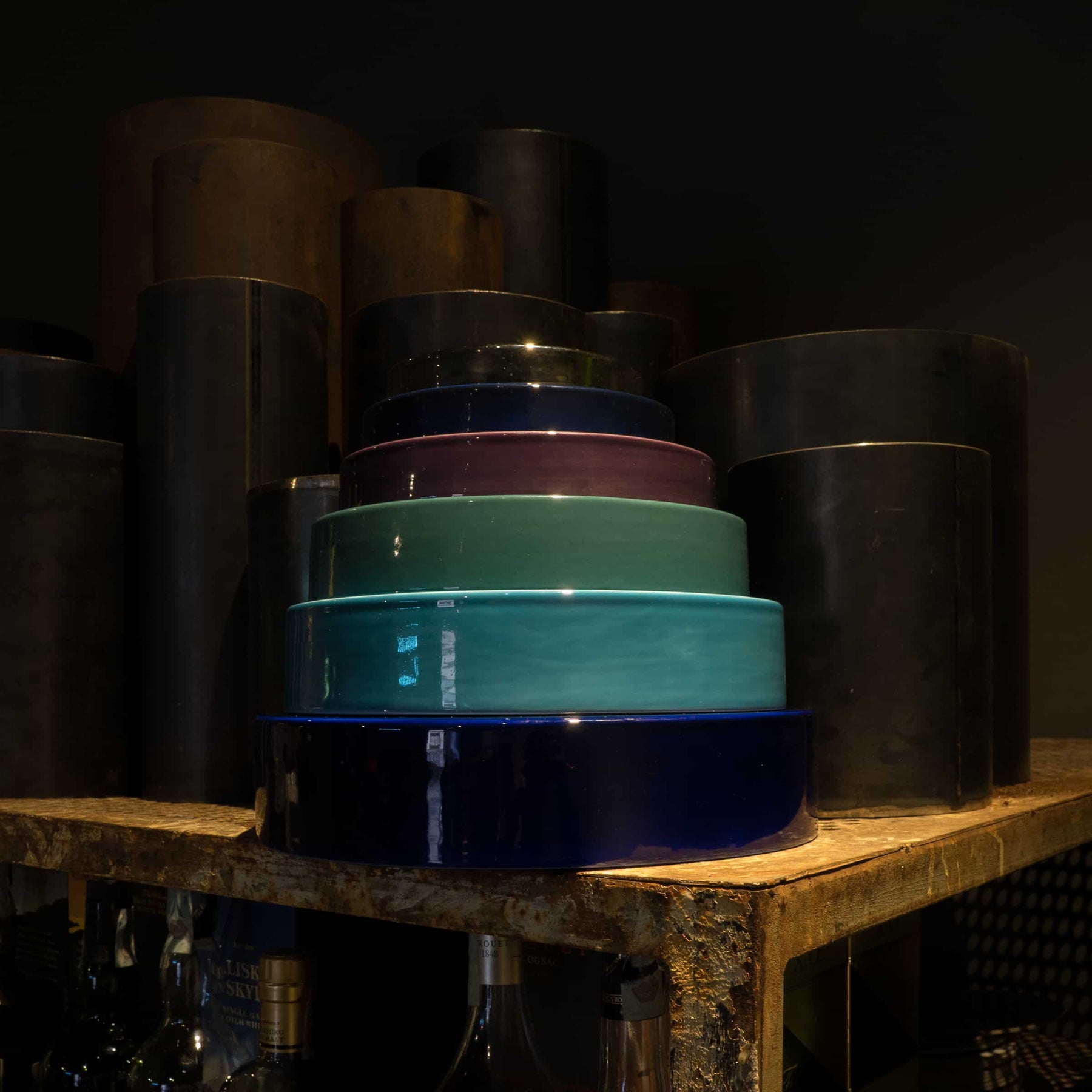 Die Zylinder haben Durchmesser von 13 bis 38 cm und Höhen von 2,5 bis 8 cm. Inspiriert vom konzentrischen Straßenlayout Mailands symbolisiert die Cerchia (Der Kreis) Kollektion die umarmende Umfassung der Stadt, die an das Wasser in den Navigli und die Straßen entlang der alten spanischen Mauern und Bastioni erinnert.