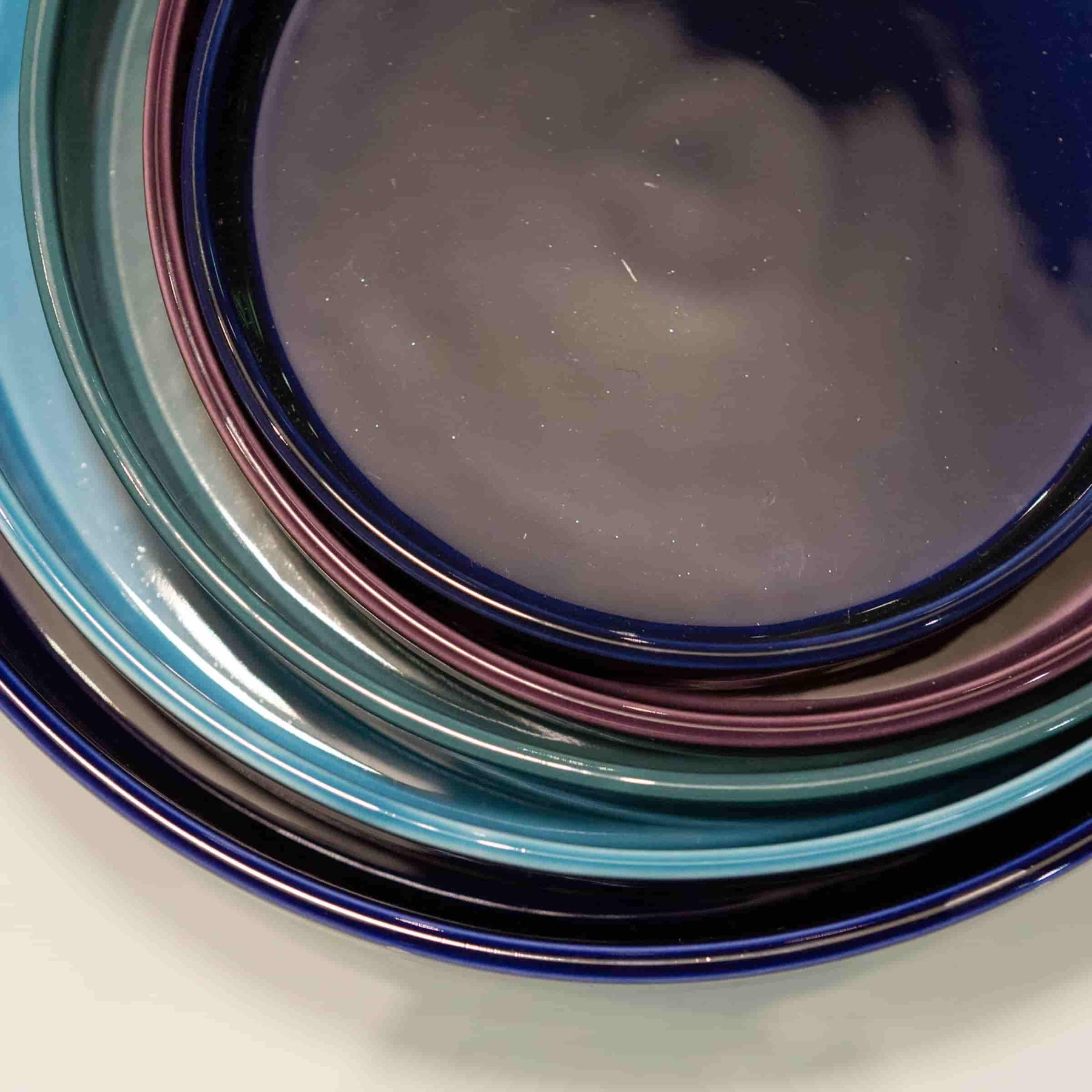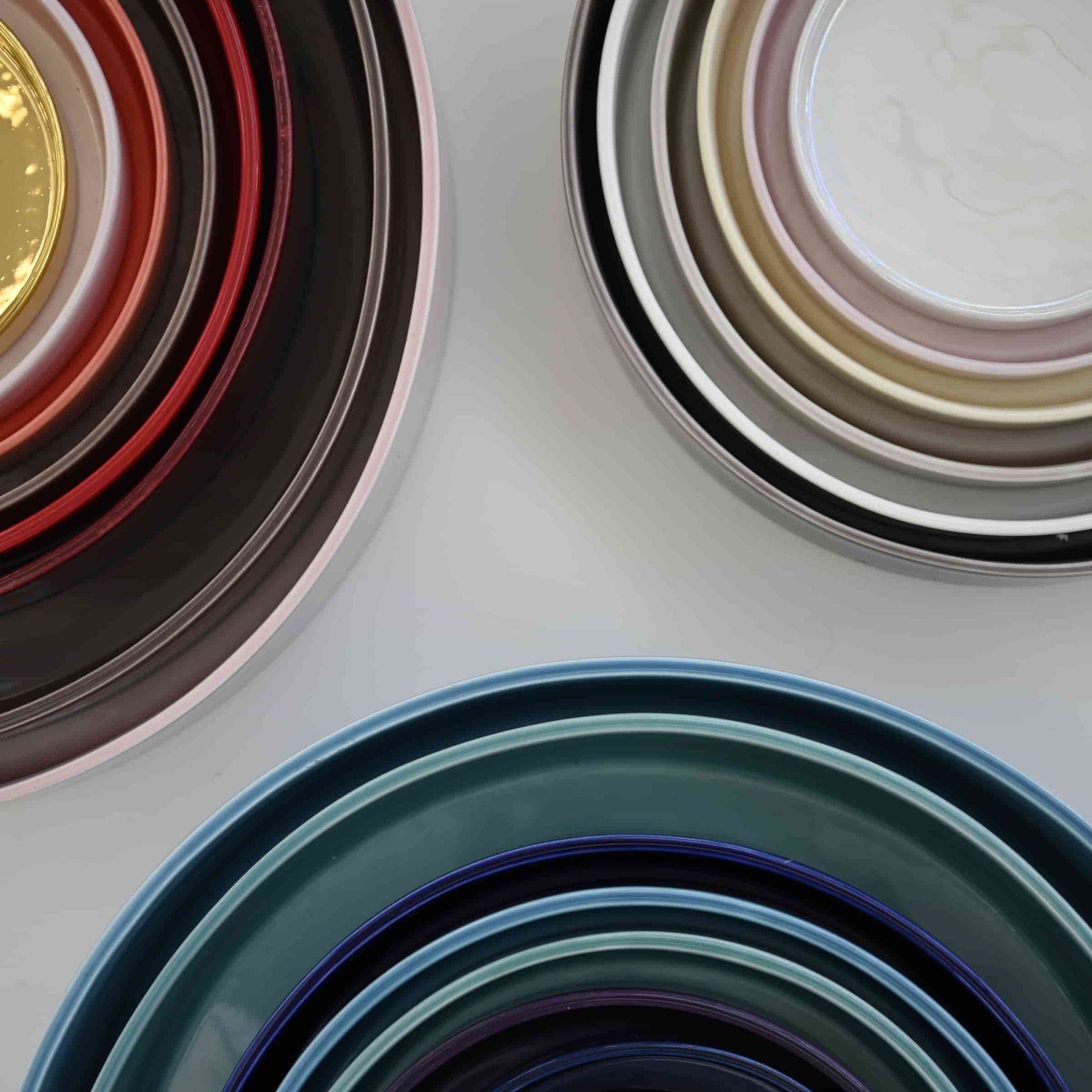 Jedes Stück, vom größten bis zum kleinsten, kann als Schüssel, Teller oder Tablett dienen und zeichnet sich durch eine Vielzahl von Farben und Größen aus, die eine ausgewogene Komposition schaffen: kühle Töne für Wasser in Cerchia Navigli, warme Rottöne für Cerchia Bastioni und neutrale Weißtöne für Cerchia Circonvallazione.