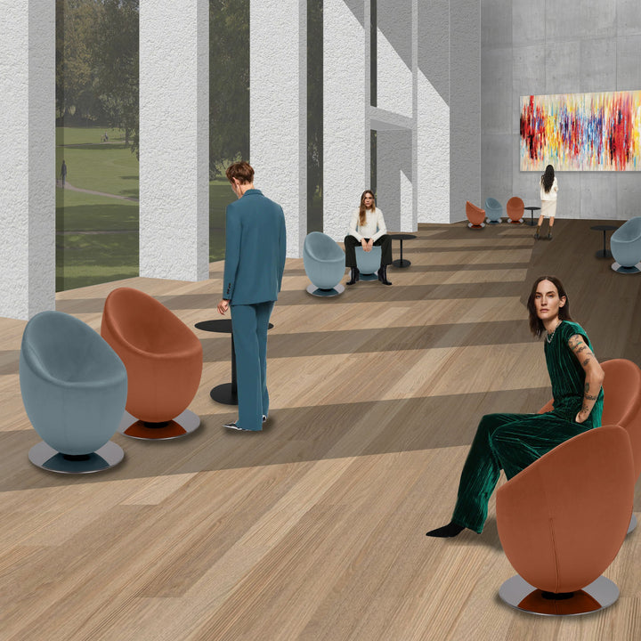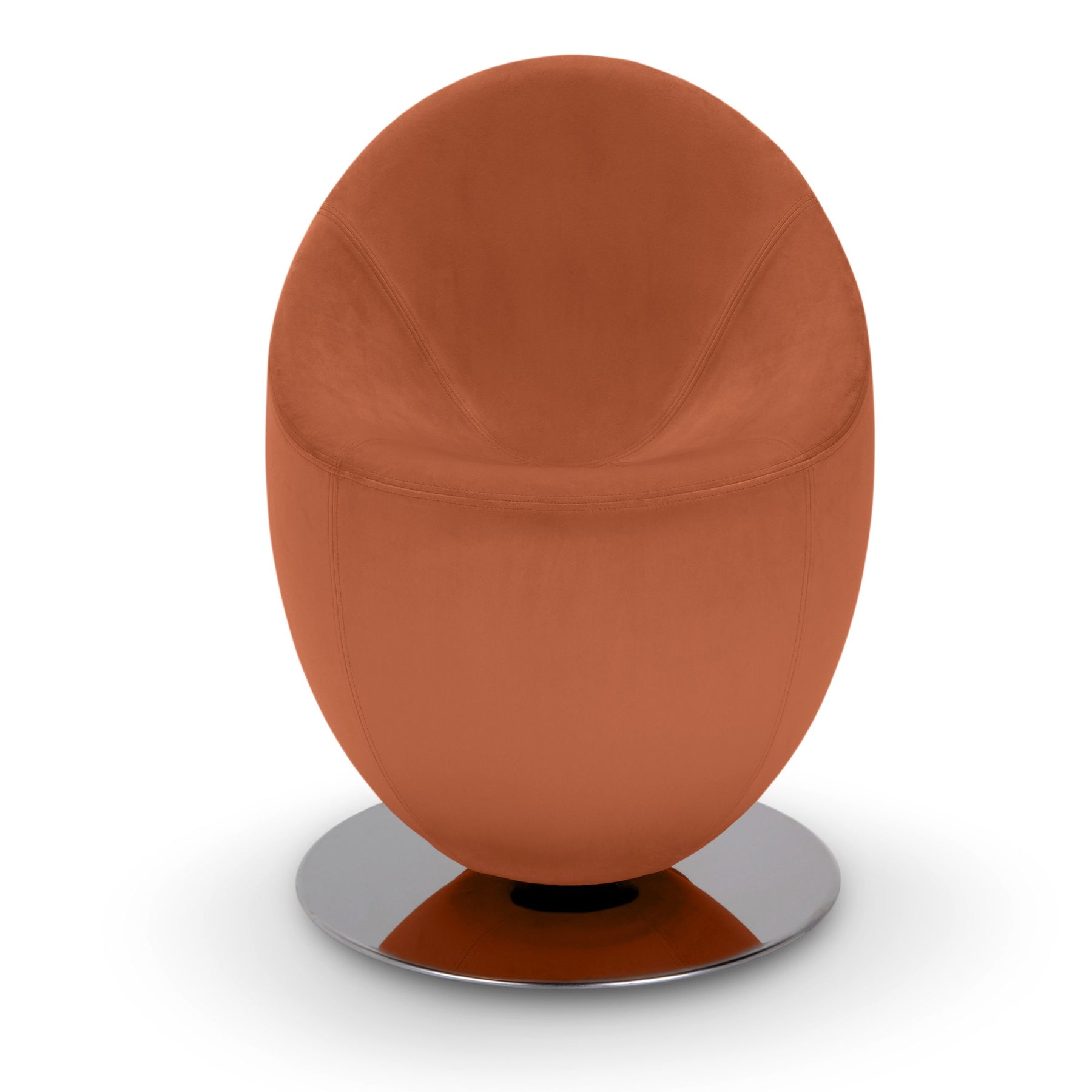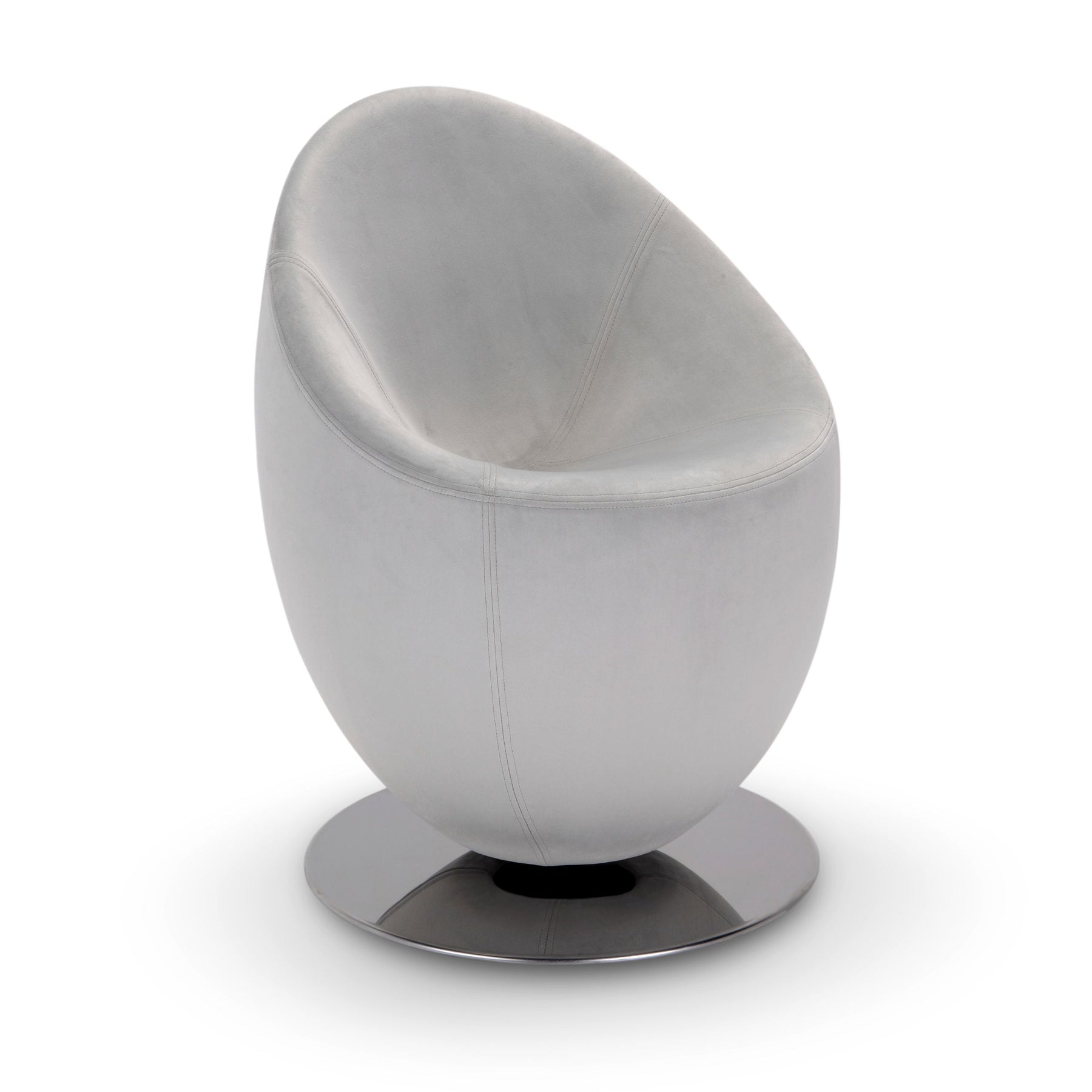 Dieser stilvolle, zeitgenössische Sessel, der die Form eines Eies hat und ein auffälliges ovales Design mit einer ausgeschnittenen Stelle aufweist, die dazu einlädt, sich zu setzen und zu entspannen, ist perfekt, um jedem Zuhause oder Büro Persönlichkeit zu verleihen. Polierter Inox-Drehfuß.