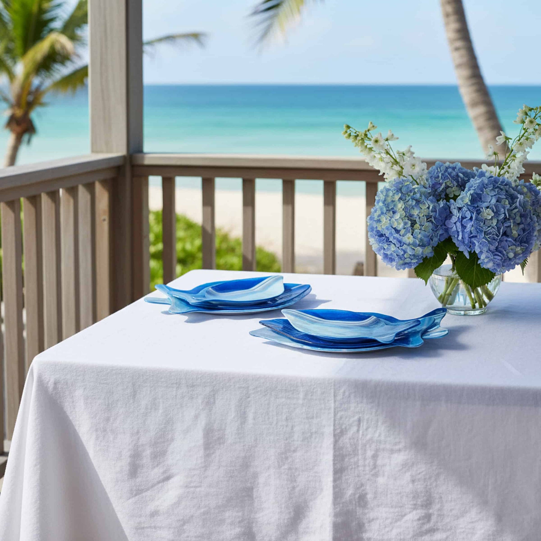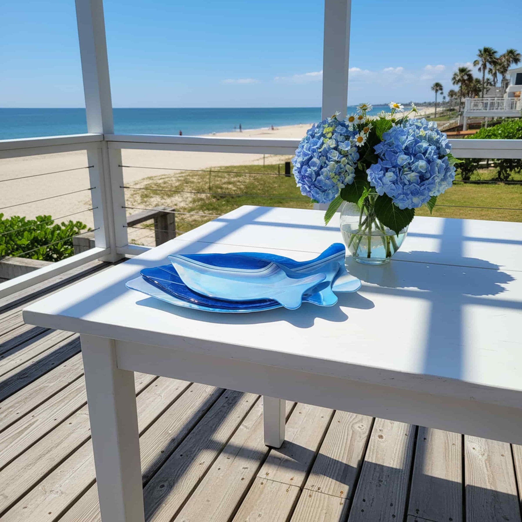 Présentant les merveilleuses nuances de l'océan, ces assiettes sont disponibles en ensembles pour 2, 4 ou 6 personnes, chaque couvert comprenant une assiette à dîner, une assiette à soupe et une assiette à salade. Chaque pièce est signée par l'artiste. Comme chaque pièce est fabriquée à la main, les tailles peuvent légèrement varier. Compatible lave-vaisselle. Les coutures de couleur sont différentes pour chaque article car ils sont entièrement faits à la main.
