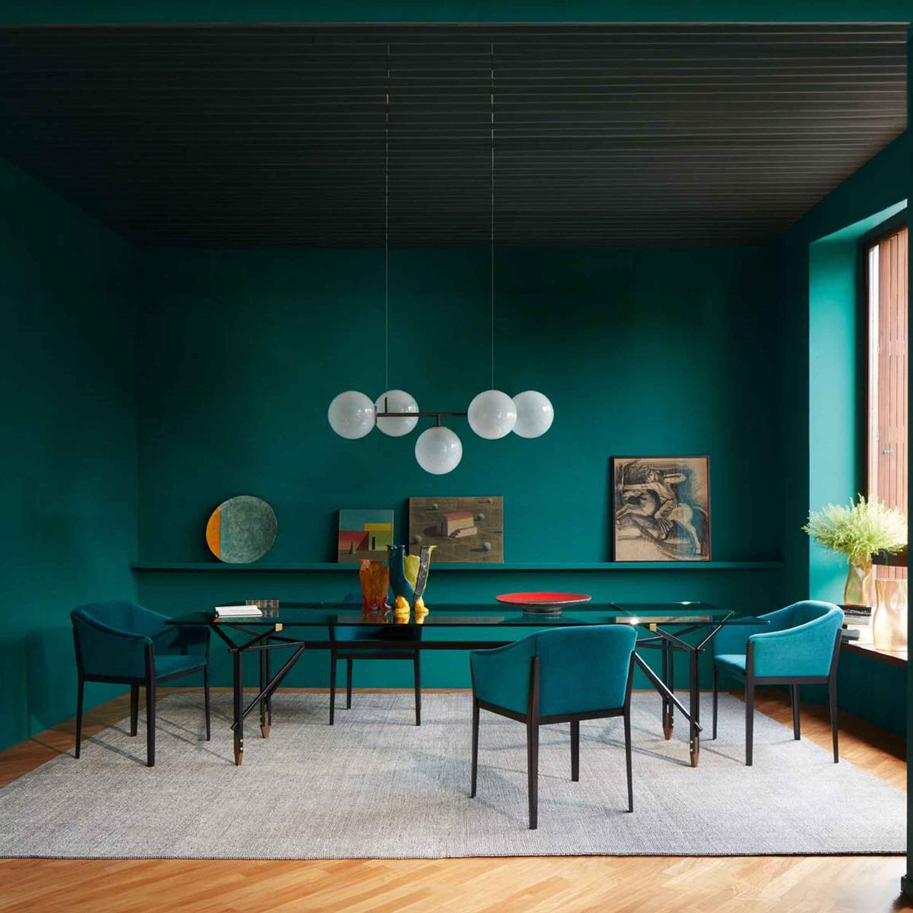 La table Olimpino possède une structure tubulaire métallique carrée, fine, audacieuse et reconnaissable, composée de deux paires de montants en forme de "Y", dont les bras intérieurs supérieurs convergent pour se rejoindre sous le plateau, tandis que les bras extérieurs divergent pour bloquer la plaque rectangulaire du plateau, en verre trempé monolithique, avec un butoir latéral en laiton. Les pieds, ainsi appariés, sont renforcés par une double barre transversale, également en métal, qui s'ouvre près des côtés et forme une double forme en "V". Les pieds en bois massif en forme de flèche embellissent le design, tout comme les grandes vis en laiton.