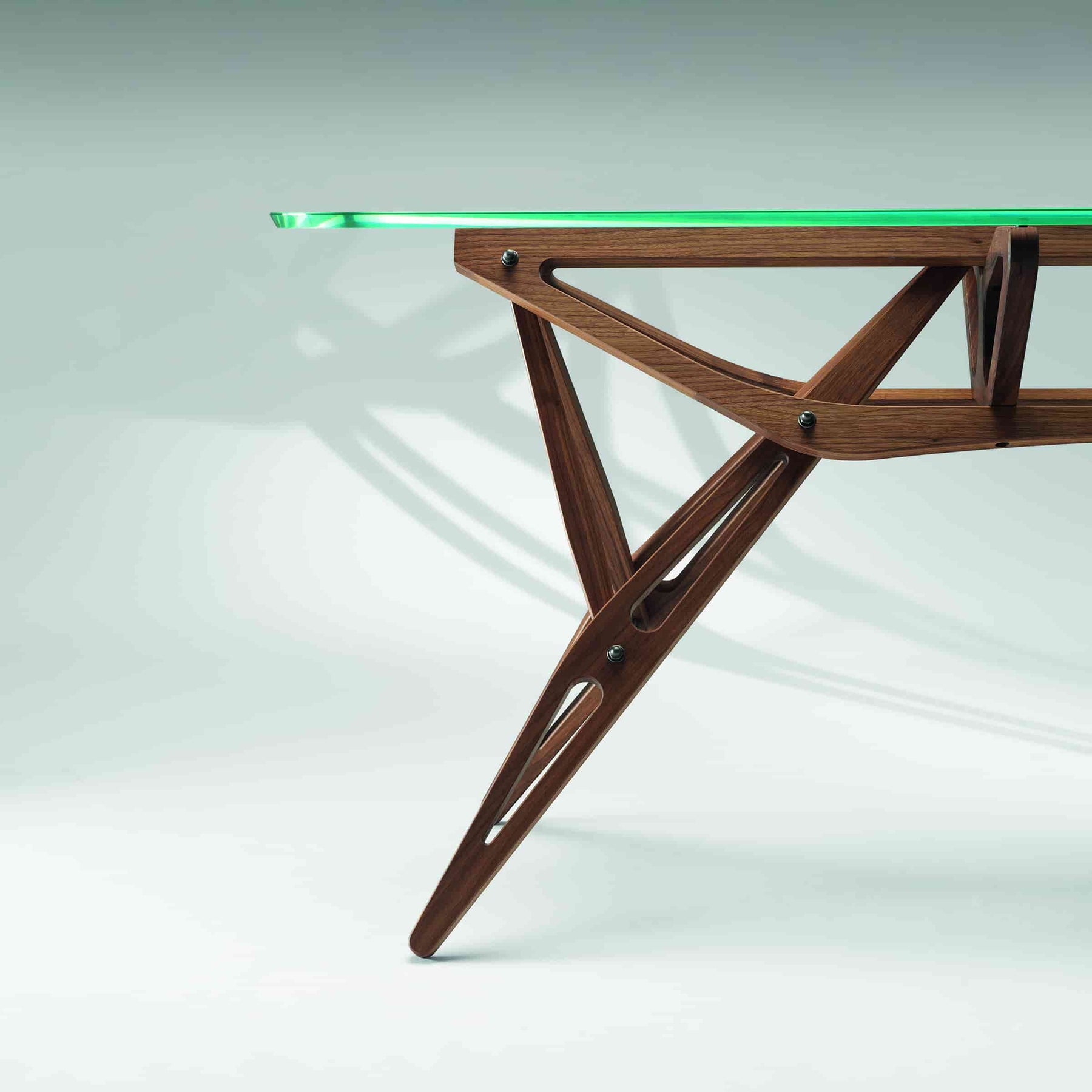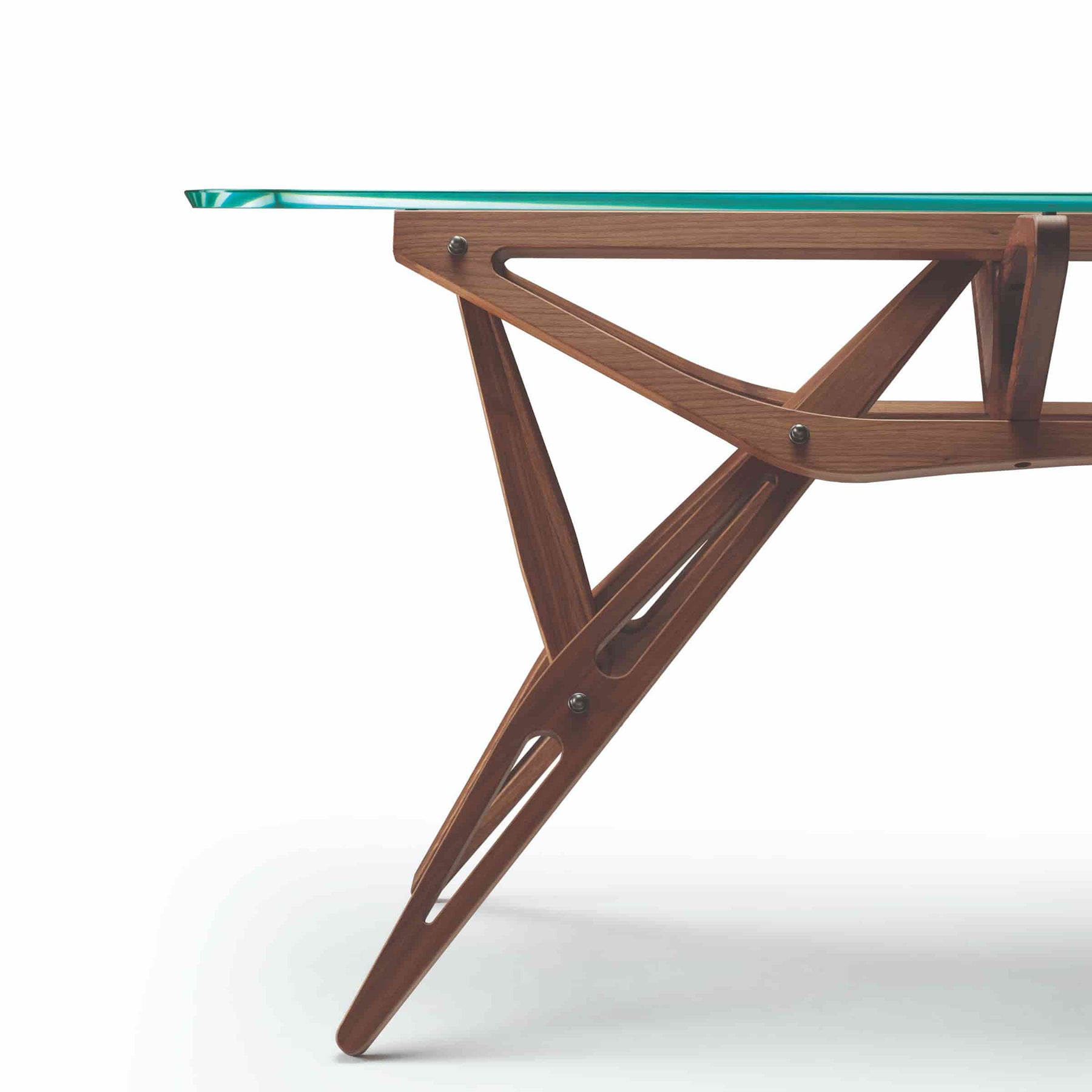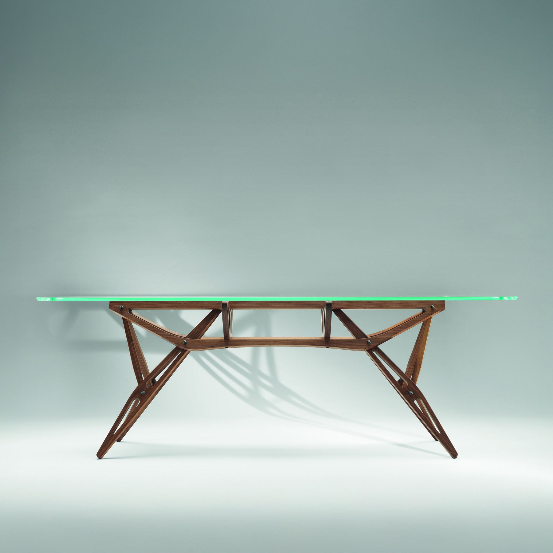 Fabriquée avec un cadre en chêne massif naturel, verni orange ou noir, ou en noyer Canaletto naturel, fini avec un vernis à la cire. Dispose d'un plateau en verre extra clair de 15 mm d'épaisseur avec des bords inclinés coupés, ou d'un plateau en verre gris fumé de 12 mm d'épaisseur avec des bords inclinés assortis, complétant le cadre en chêne noir.