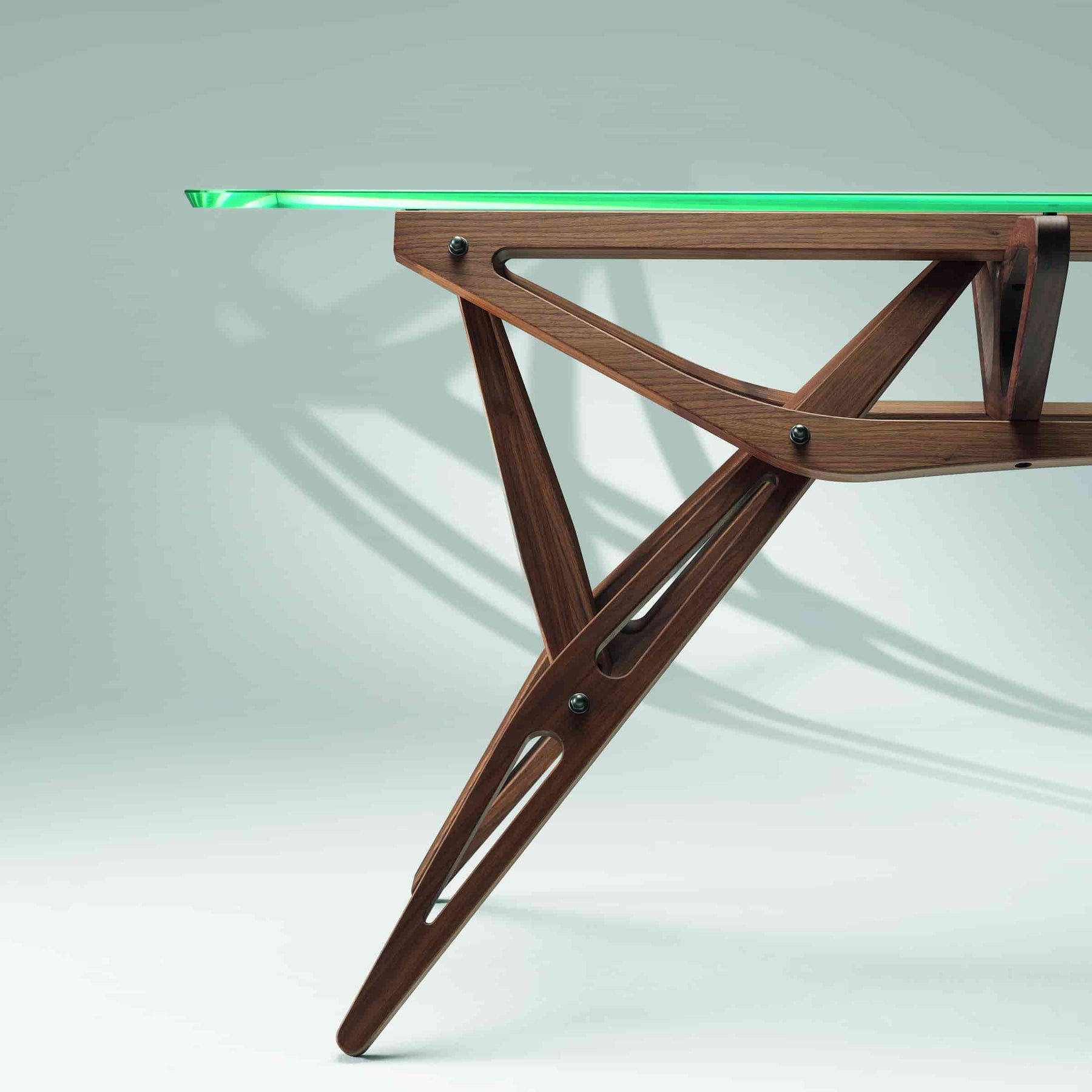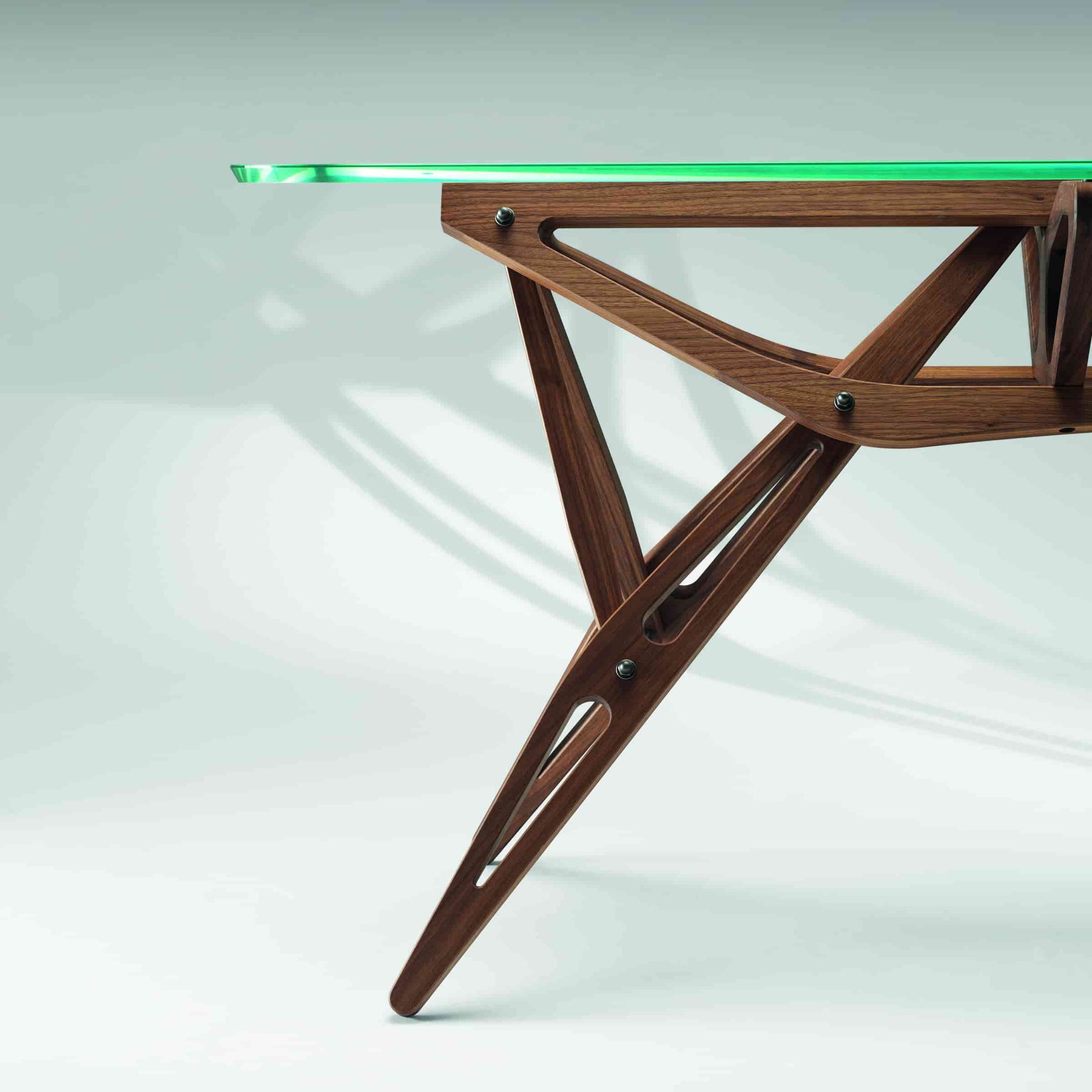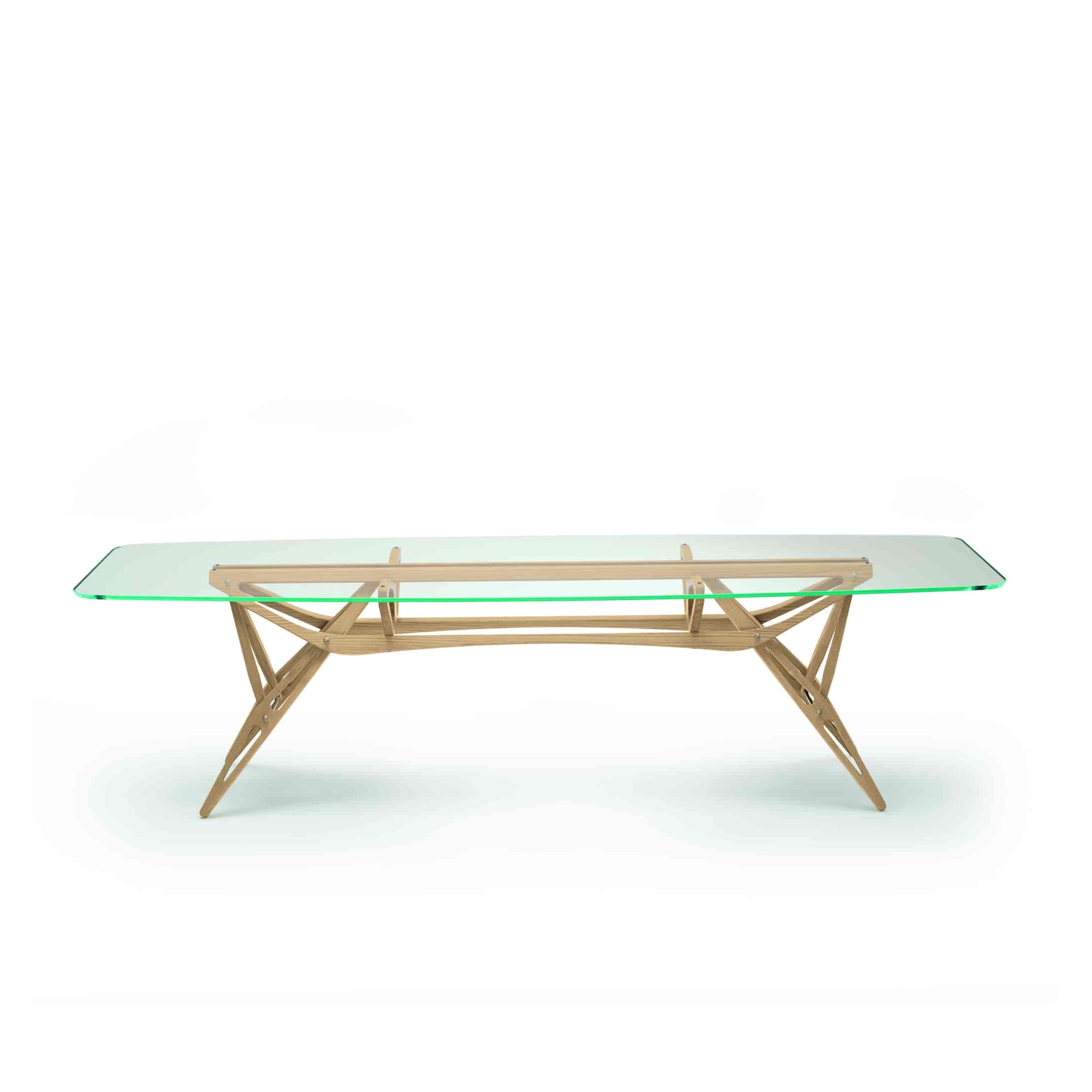 Fabriquée avec un cadre en chêne massif naturel, verni orange ou noir, ou en noyer Canaletto naturel, fini avec un vernis à la cire. Dispose d'un plateau en verre extra clair de 15 mm d'épaisseur avec des bords inclinés coupés, ou d'un plateau en verre gris fumé de 12 mm d'épaisseur avec des bords inclinés assortis, complétant le cadre en chêne noir.