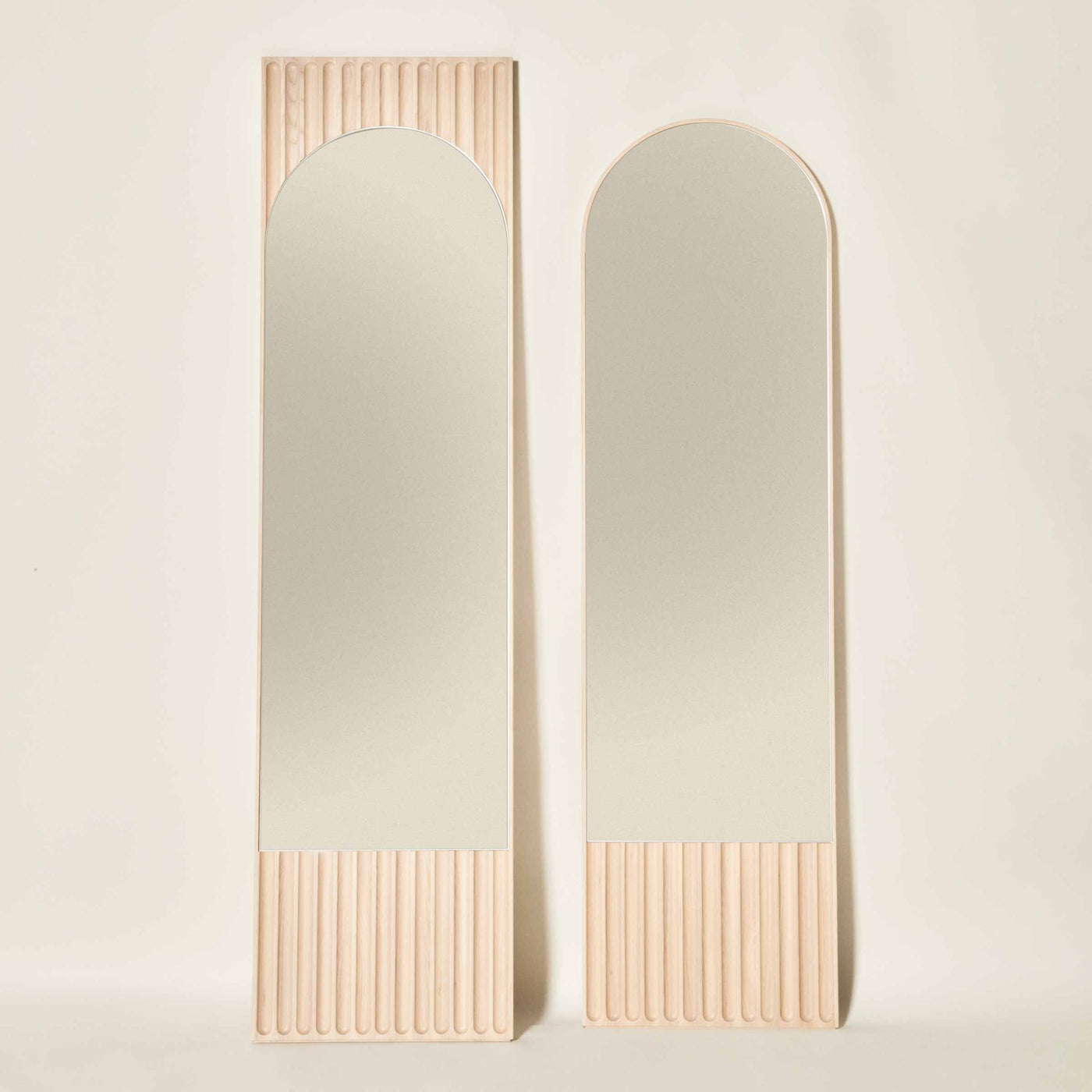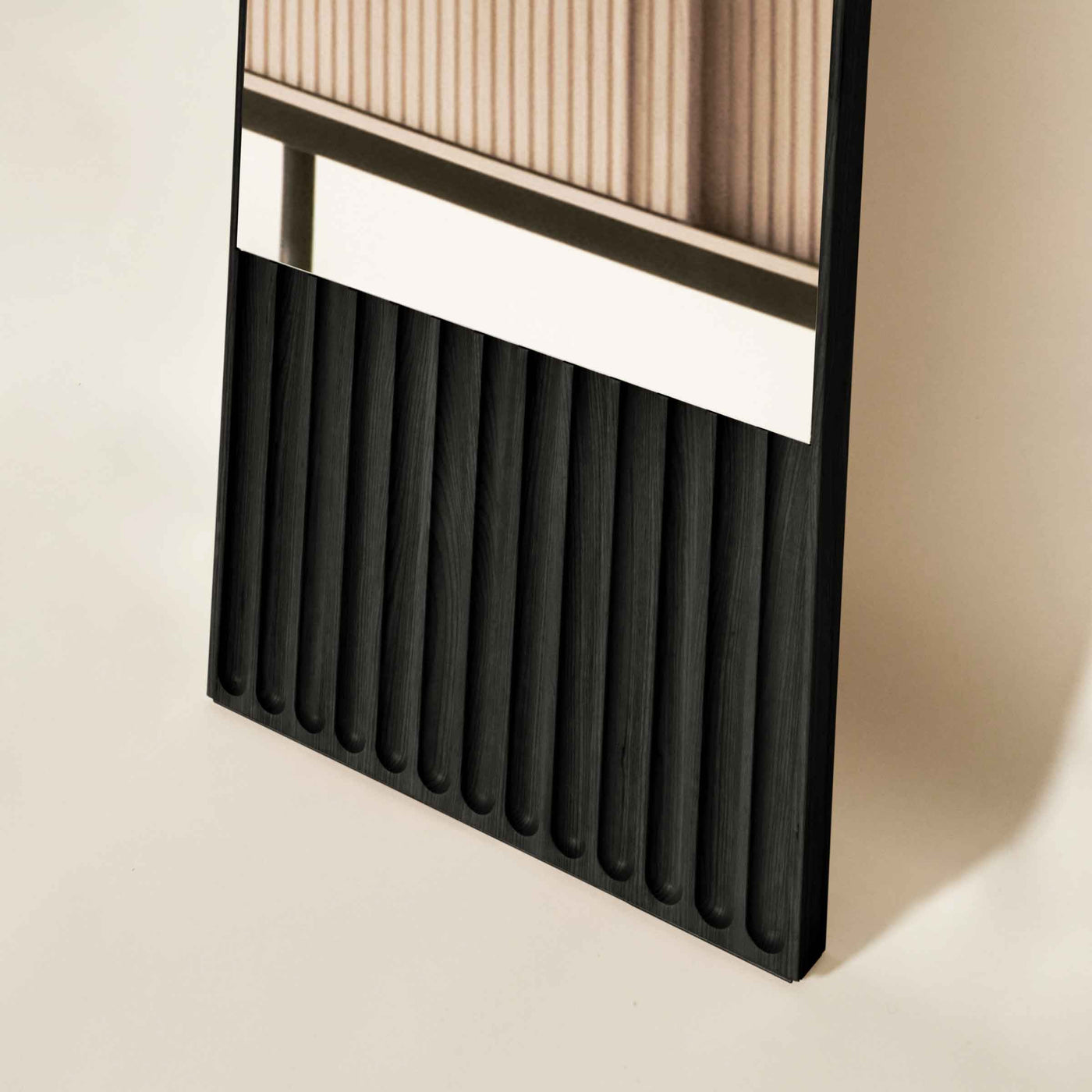 Ce miroir est conçu pour attirer l'attention grâce à son contraste saisissant entre le cadre léger et la base imposante. Le motif fraisage ajoute un motif décoratif qui interagit avec la lumière et l'ombre, produisant des effets visuels captivants qui varient selon le placement. Ces miroirs sont disponibles en versions rectangulaires et ovales et offrent des options polyvalentes pour convenir à différentes préférences.