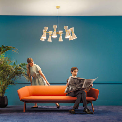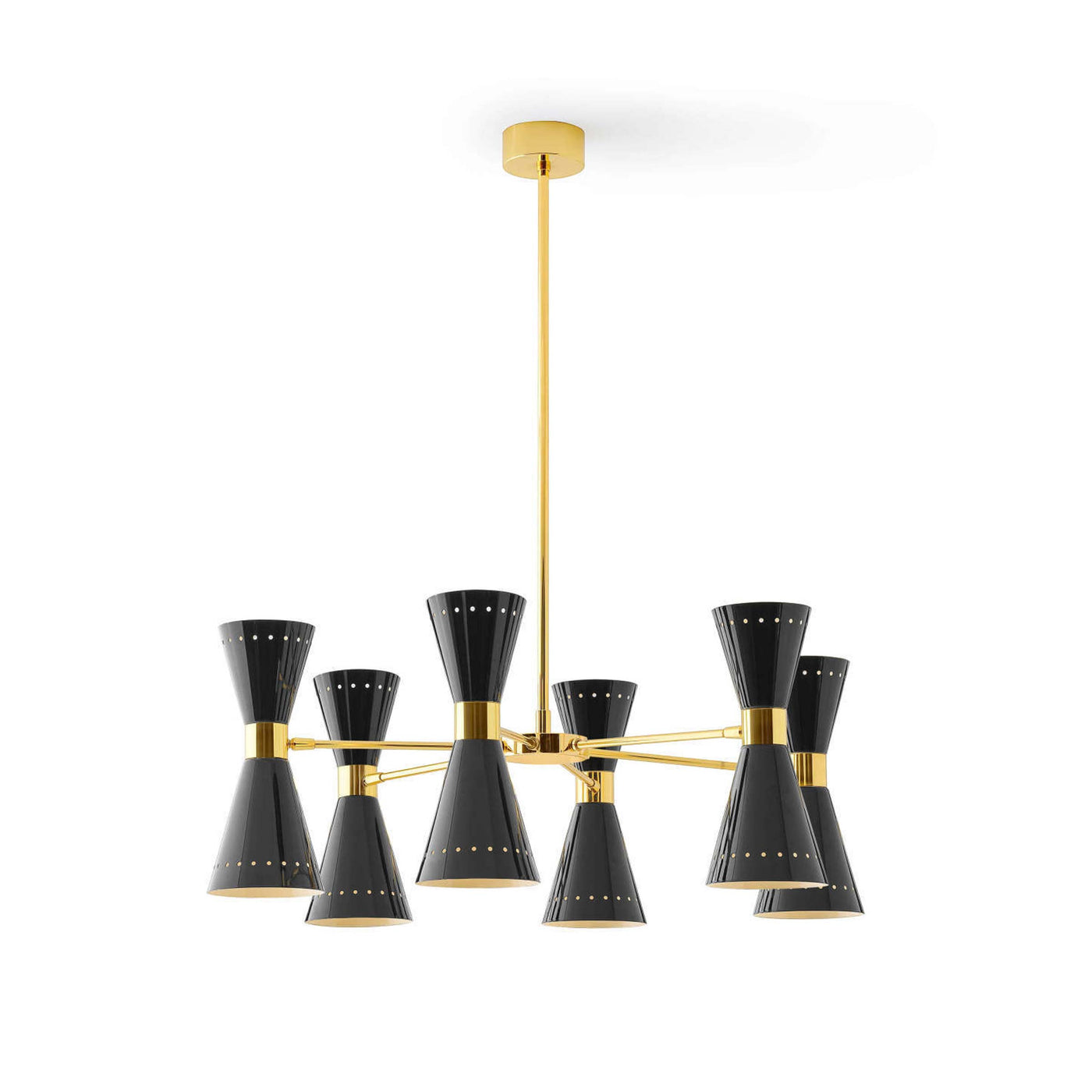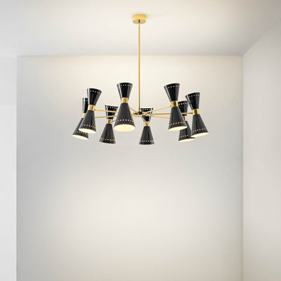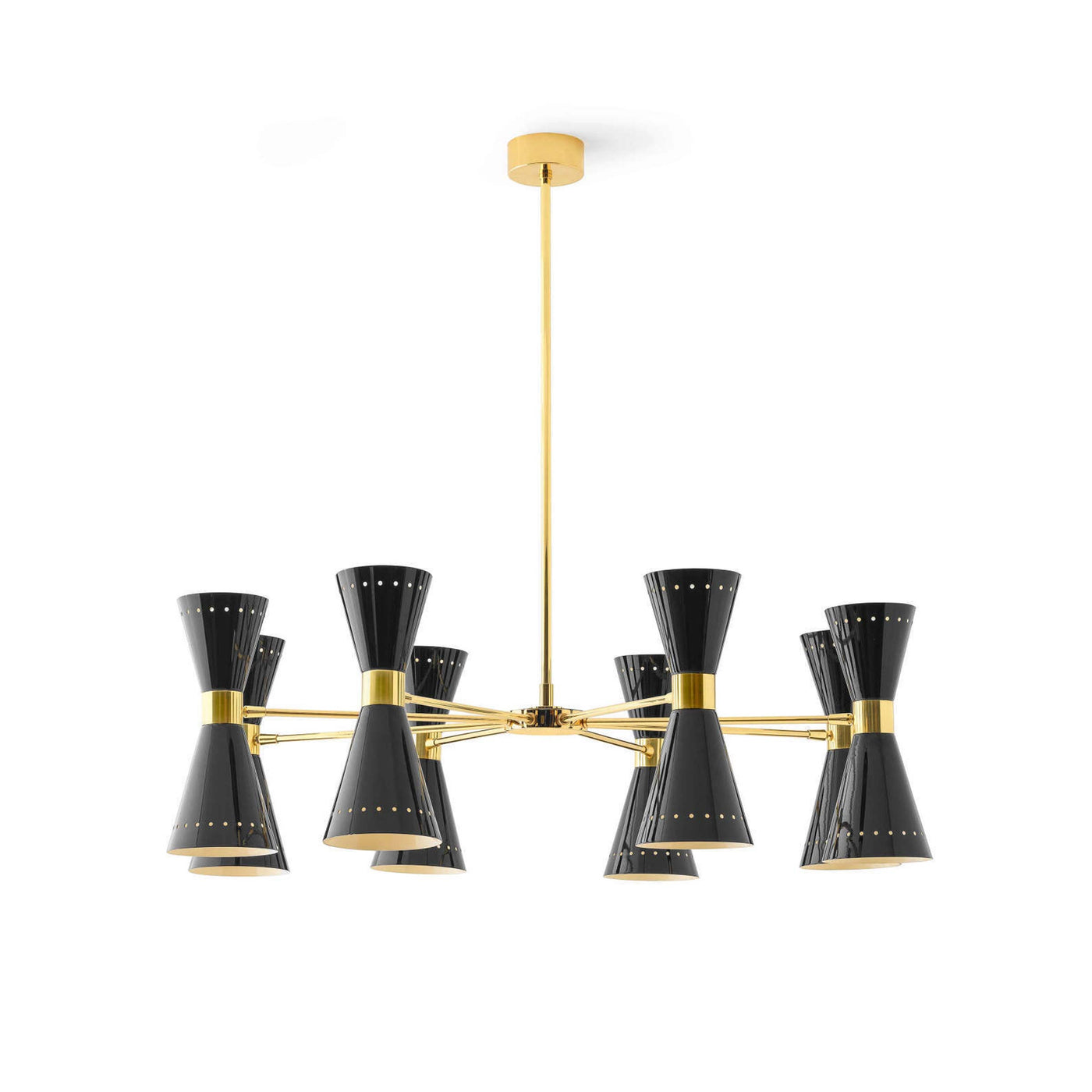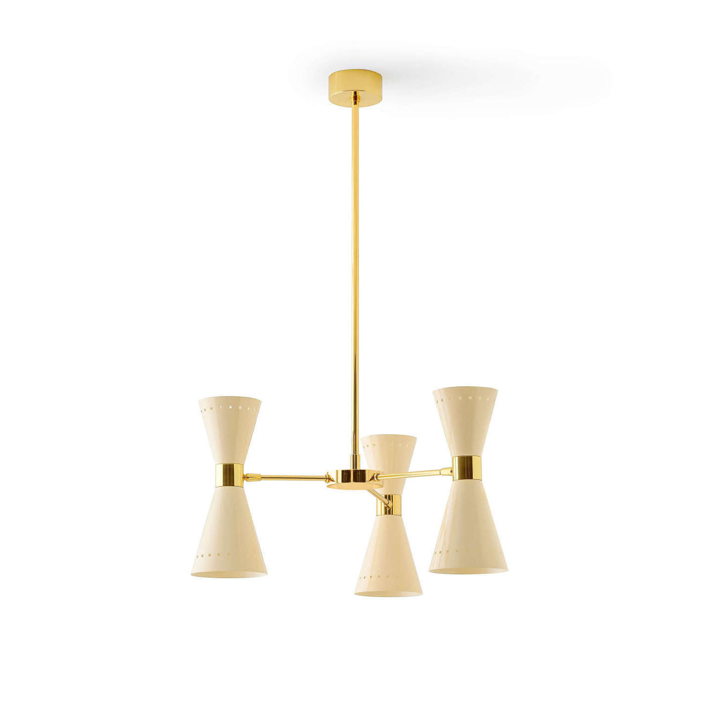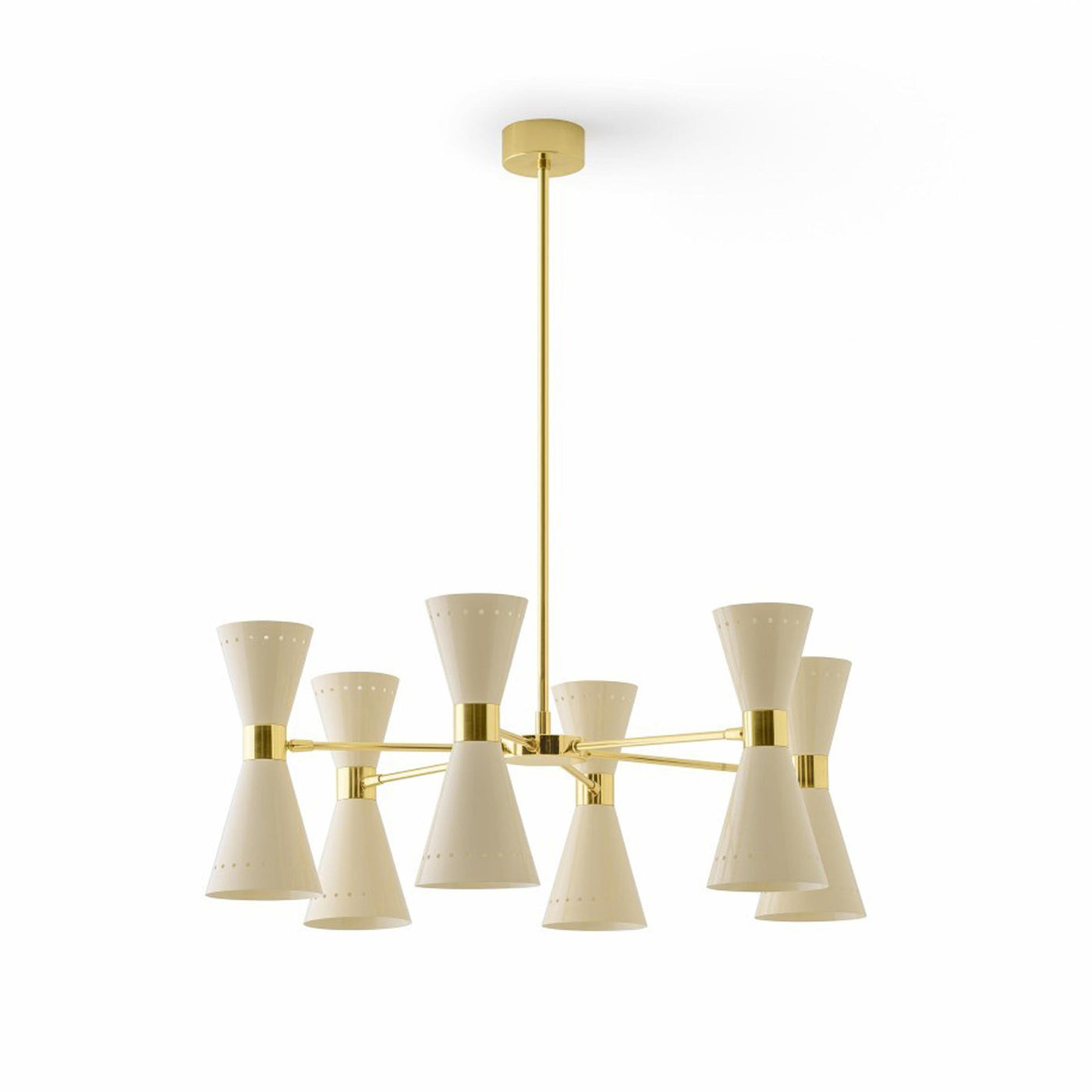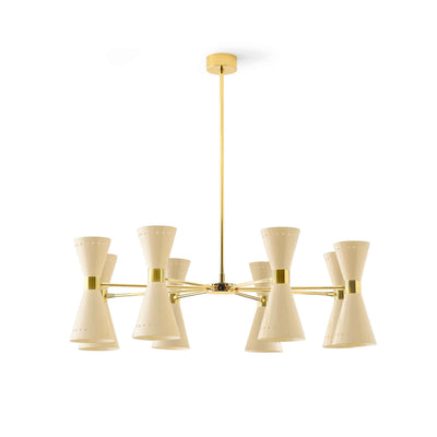 Disponible avec trois, six ou huit bras, ce lustre du milieu du siècle présente un corps en laiton plaqué or et des abat-jours doubles en forme de cône vers le haut et vers le bas, en finition ivoire ou noir brillant.