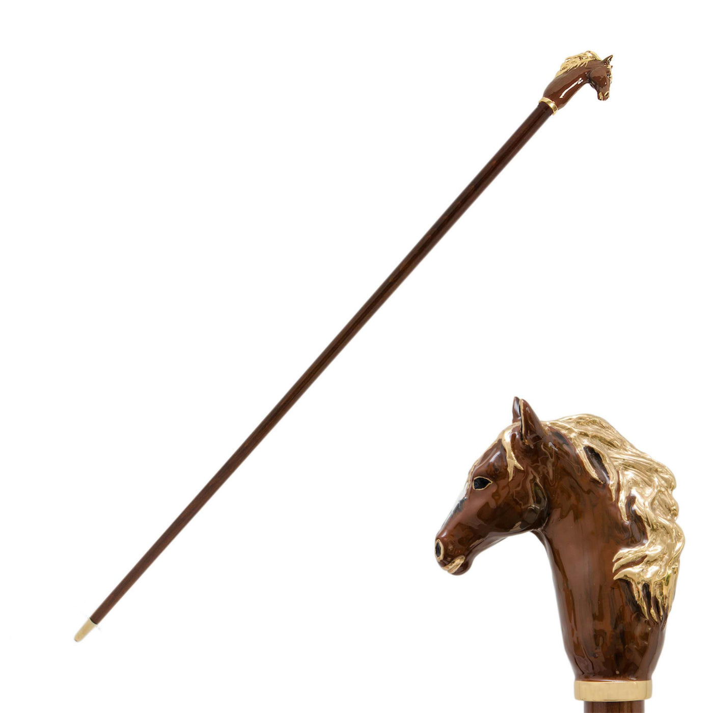 La poignée de cette canne présente le design emblématique du cheval, accompagnée d'un élégant fût en bois et d'une extrémité en laiton avec une prise en caoutchouc confortable. Élevez votre style avec cet accessoire distinctif et élégant.
