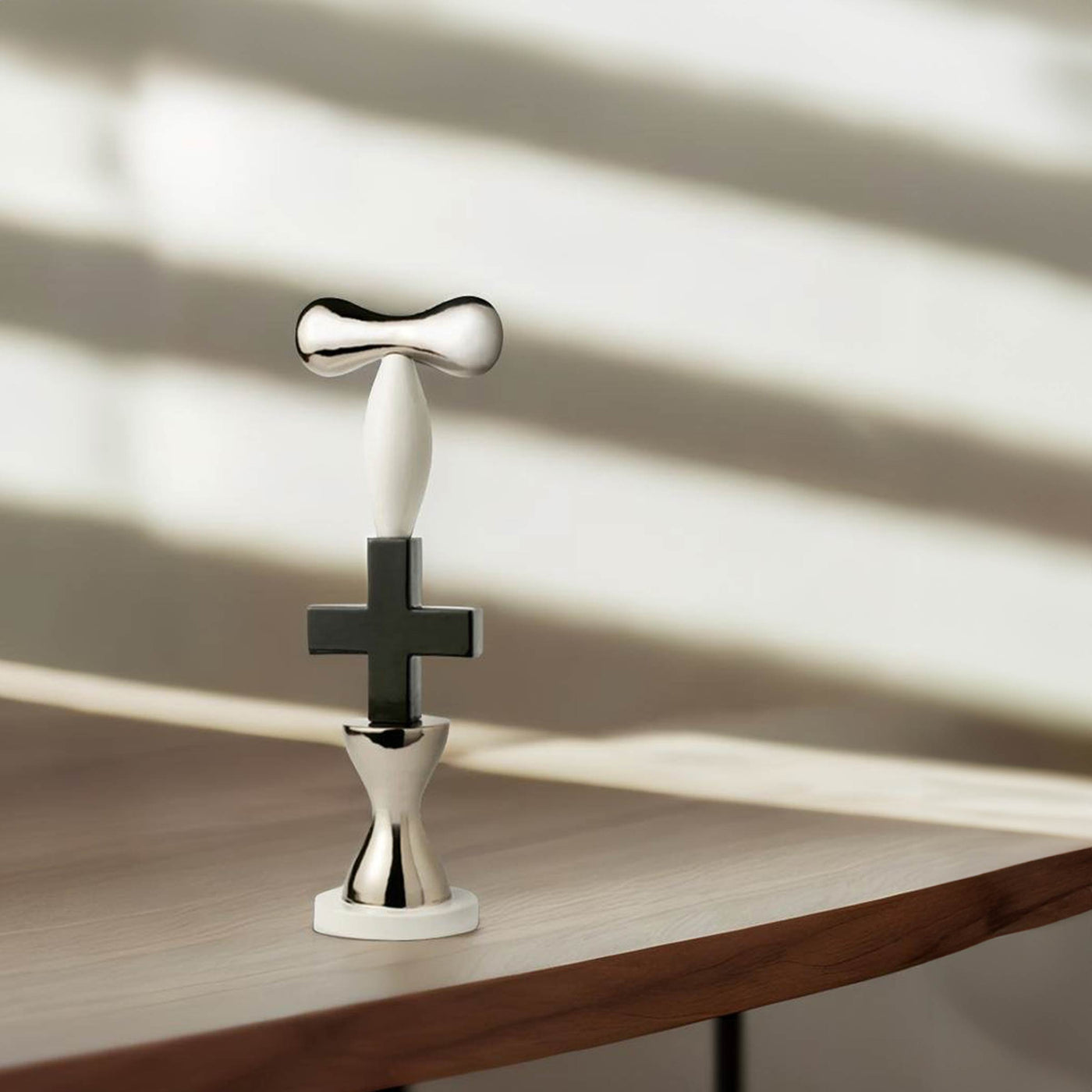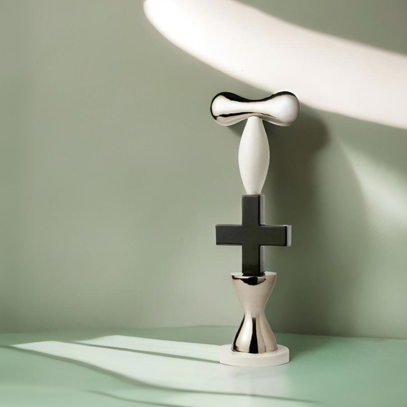 Faisant partie de la collection Symbolik qui comprend des sculptures en édition limitée en argile blanche, cette pièce comporte cinq éléments assemblés à la main avec un glaçage brillant.