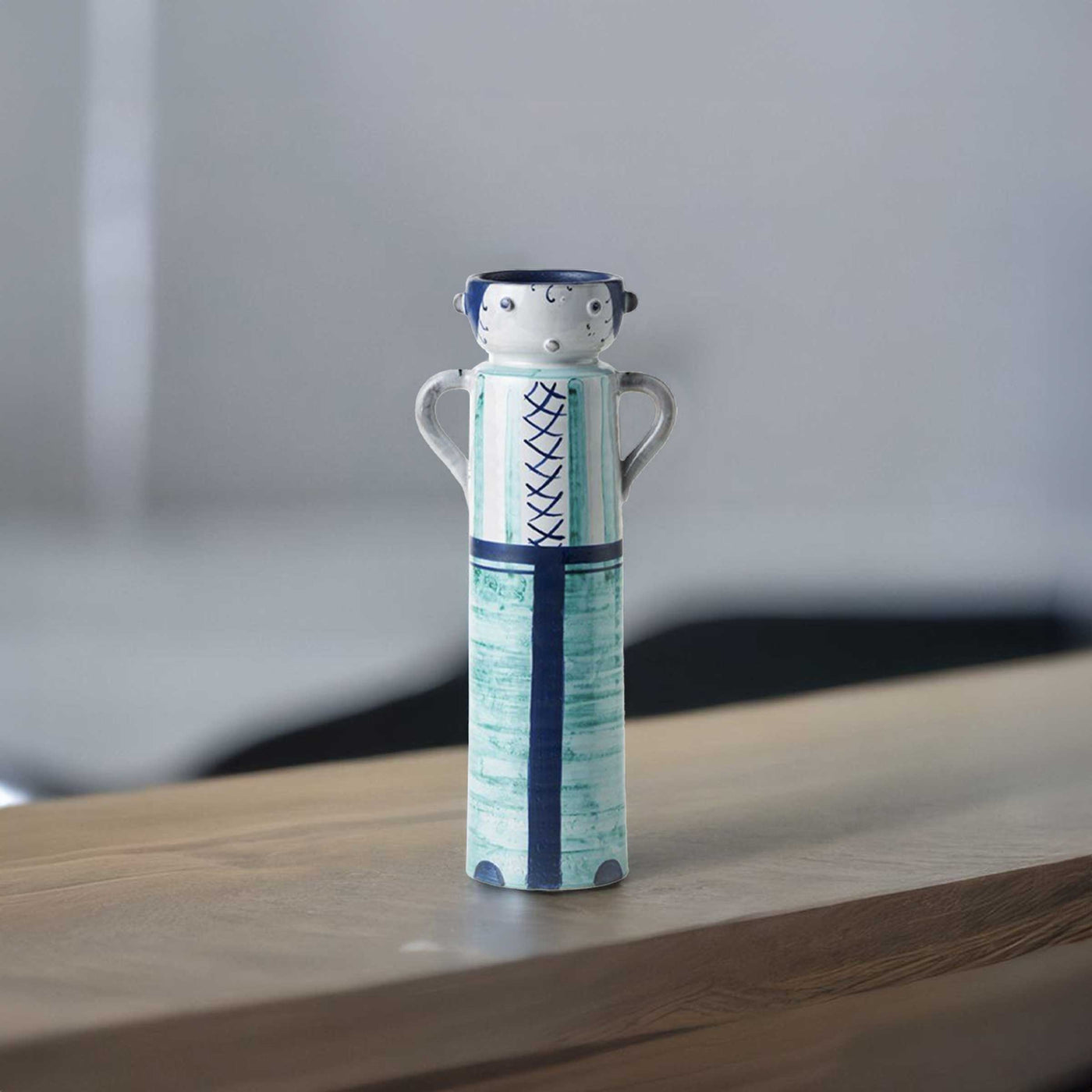 Façonné sous la forme d'une personne les mains sur les hanches, ce vase en argile a été tourné à la main et présente des décorations en émail blanc, bleu et vert.