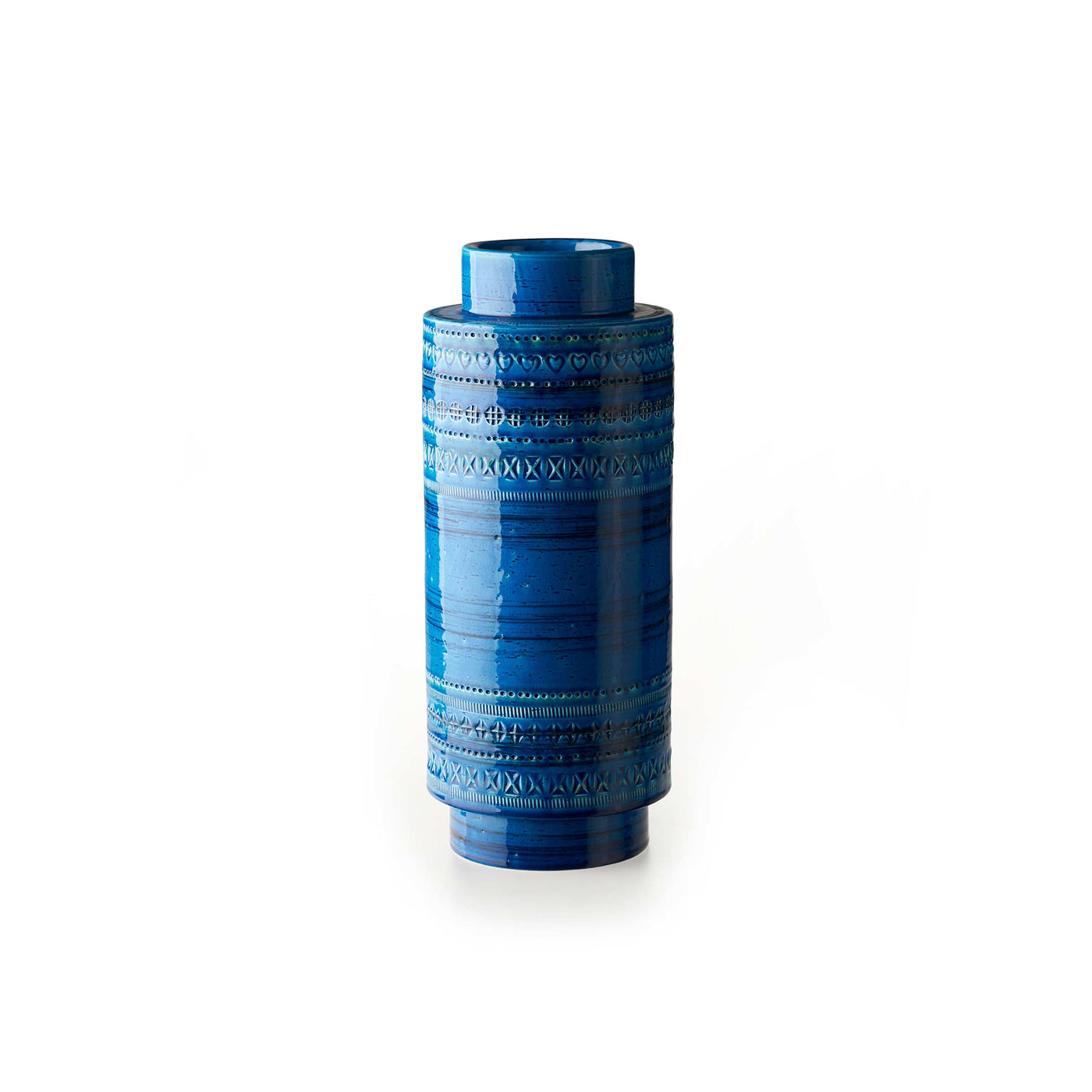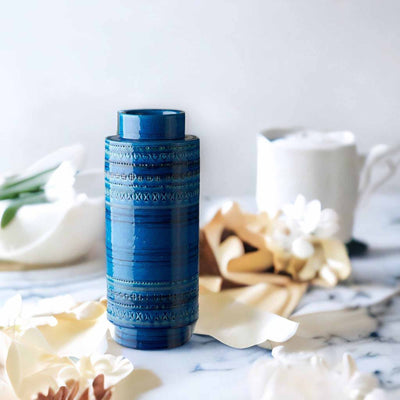 Cette pièce fait partie de la série Rimini Blu. Fabriqué en argile blanche et présentant une décoration réalisée avec une gravure manuelle au pochoir, ce vase émaillé bleu est un accessoire parfait pour tout espace.