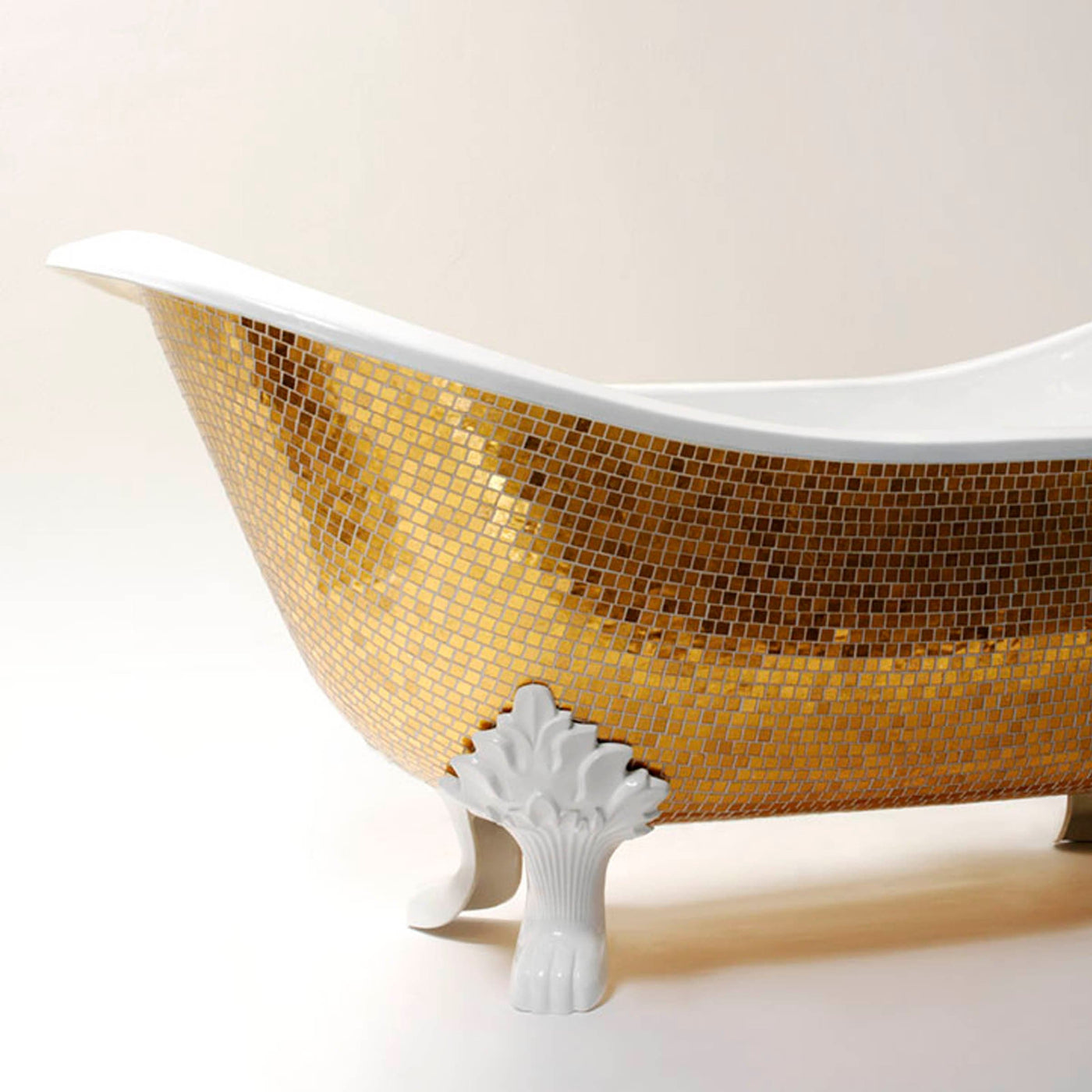 MAXIMA est une baignoire luxueuse en fonte à pattes de lion par Sicis, entièrement recouverte de mosaïques en feuilles d'or.