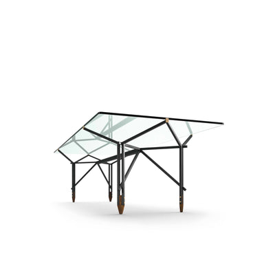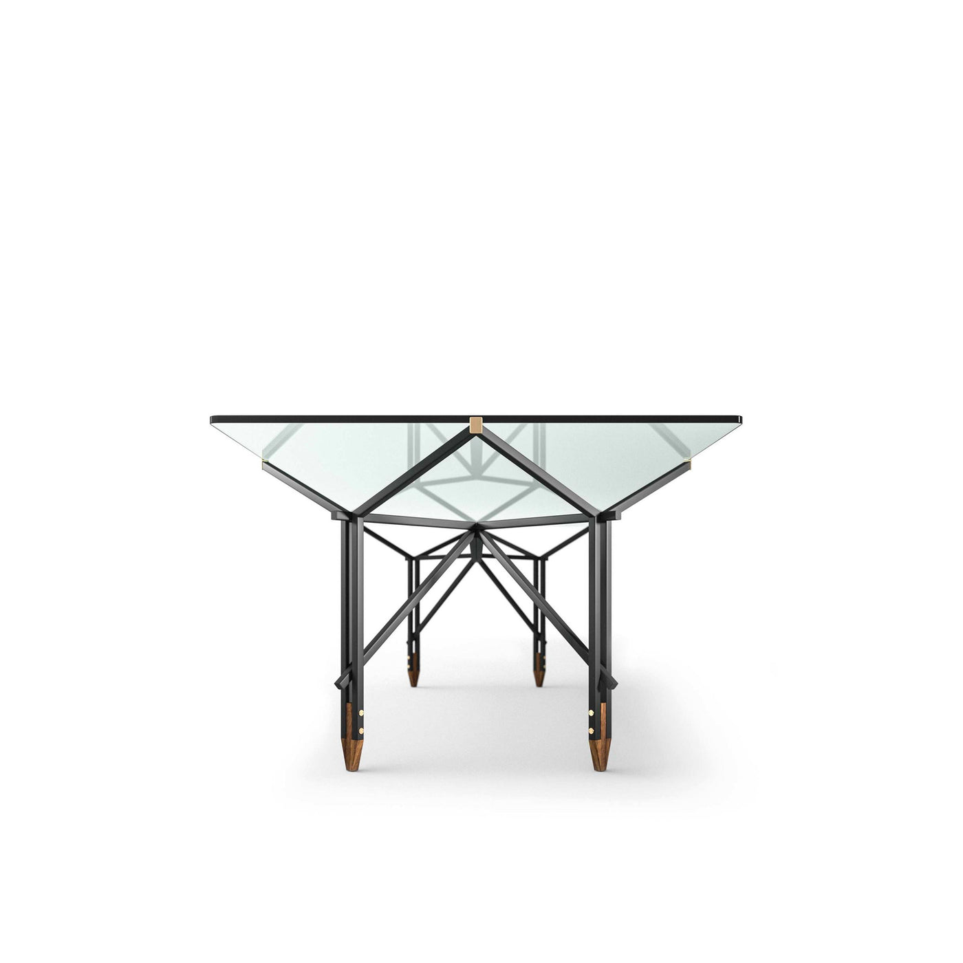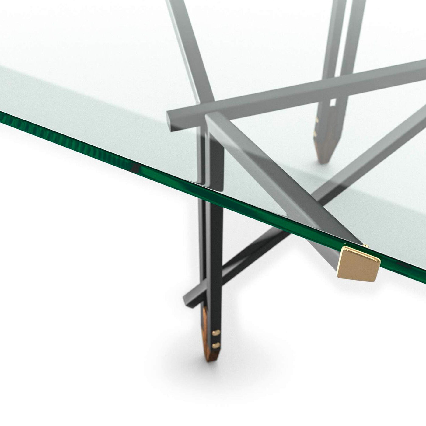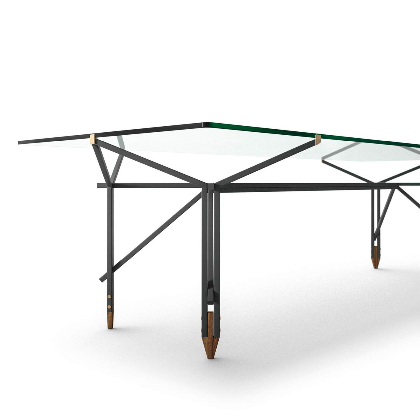 La table Olimpino possède une structure tubulaire métallique carrée, fine, audacieuse et reconnaissable, composée de deux paires de montants en forme de "Y", dont les bras intérieurs supérieurs convergent pour se rejoindre sous le plateau, tandis que les bras extérieurs divergent pour bloquer la plaque rectangulaire du plateau, en verre trempé monolithique, avec un butoir latéral en laiton. Les pieds, ainsi appariés, sont renforcés par une double barre transversale, également en métal, qui s'ouvre près des côtés et forme une double forme en "V". Les pieds en bois massif en forme de flèche embellissent le design, tout comme les grandes vis en laiton.