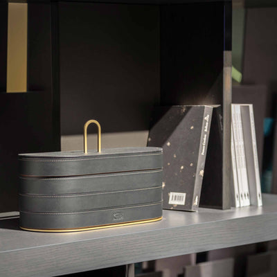 Minimalistes et ultracontemporains, ces contenants empilables peuvent être utilisés pour ranger des bijoux ou de petits objets du quotidien. Disponibles en versions ovale et ronde, ce design comprend quatre plateaux empilables en bois massif de noyer Canaletto, finis avec du cuir Pelle Frau® Saddle Extra. Chaque plateau, dont le supérieur est muni d'un couvercle, peut être glissé un par un hors d'une base en aluminium à finition laiton mat.