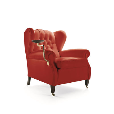 Classique et intemporel, ce fauteuil à oreilles est revêtu d'un cuir Pelle Frau ColorSphere® non amovible en rouge ou gris anthracite, et présente un capitonnage élégant sur le dossier ainsi que des roulettes métalliques comme ses deux pieds avant. Avec une assise en crin de cheval caoutchouté, un dossier et des accoudoirs en crin de cheval végétal moulé à la main, et un coussin d'assise rempli de duvet d'oie, ce fauteuil est accompagné d'un cendrier pratique et élégant en bois et métal avec un bras pivotant en bronze à finition dorée.