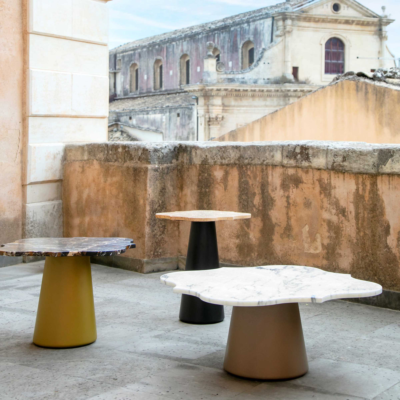 Les tables basses en marbre Borromeo sont disponible avec des plateaux en trois types différents de marbre, inspirés par la façade de l'église baroque du XVIIIe siècle San Carlo al Corso, dans le centre historique de la ville sicilienne de Noto.
