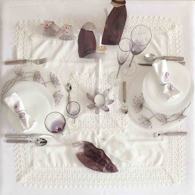 Disponible en services pour 2, 4 ou 6 personnes, chaque couvert comprend une assiette à dîner décorée de platine 999,9 et votre choix de murrina violette ou blanche dans un motif floral, une assiette à salade et une assiette à soupe. Chaque pièce est signée par l'artiste. Compatible lave-vaisselle.