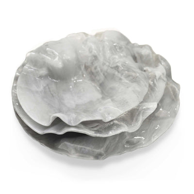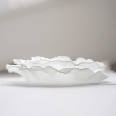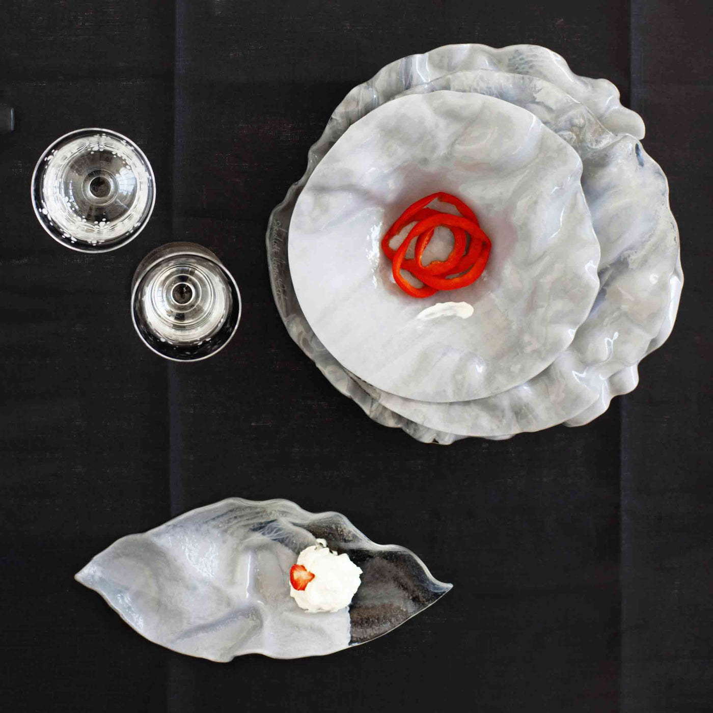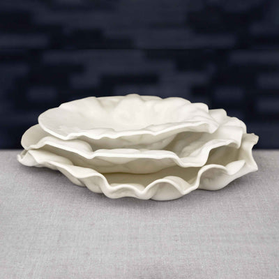 Présentant des plis et des courbes délicats, ces assiettes sont disponibles en services pour 2, 4 ou 6 personnes, chaque couvert comprenant une assiette de dîner, une assiette à soupe et une assiette à salade. Chaque pièce est signée par l'artiste. Comme chaque pièce est fabriquée à la main, les tailles peuvent varier légèrement. Compatible lave-vaisselle.