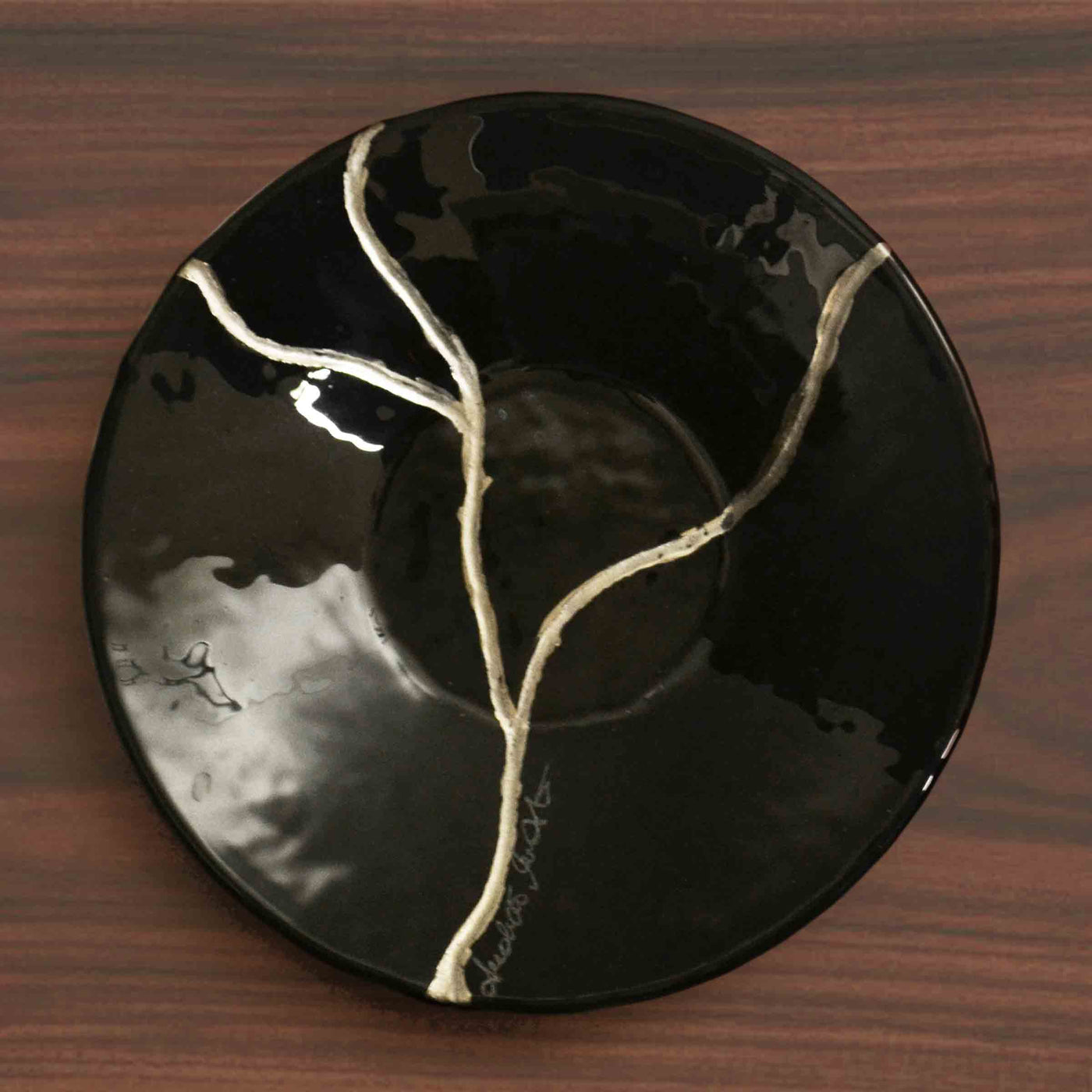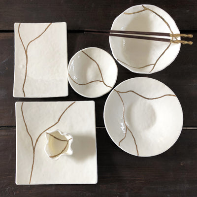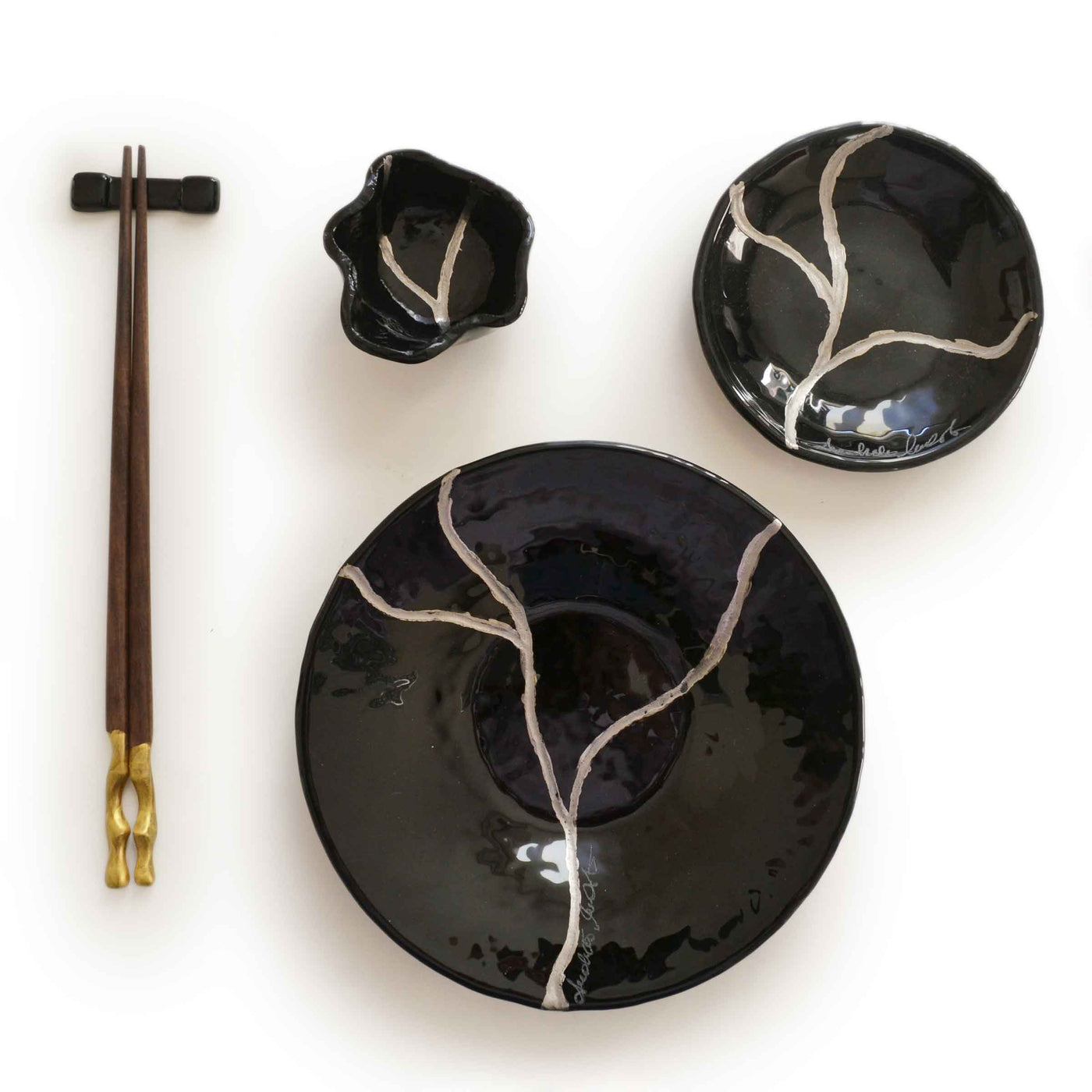 Disponibles en sets pour 2, 4 ou 6 personnes, ces assiettes sont proposées en noir avec des rainures remplies de platine 999,9 ou en blanc cassé avec des rainures remplies d'or 24 carats. Chaque service comprend une assiette de dîner, une assiette à salade, un bol et un porte-baguettes, et chaque pièce est signée par l'artiste. Compatible lave-vaisselle. Baguettes non incluses.