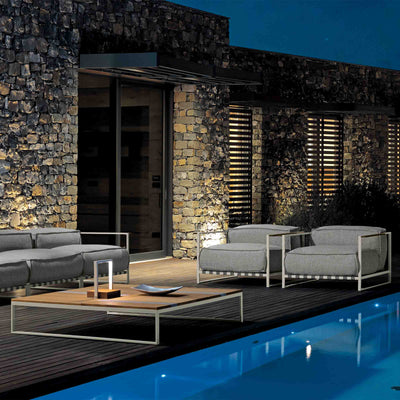 La table basse d'extérieur en bois et acier CASILDA a été conçue par Ramón Esteve pour Talenti et a été fabriquée à la main en Italie.