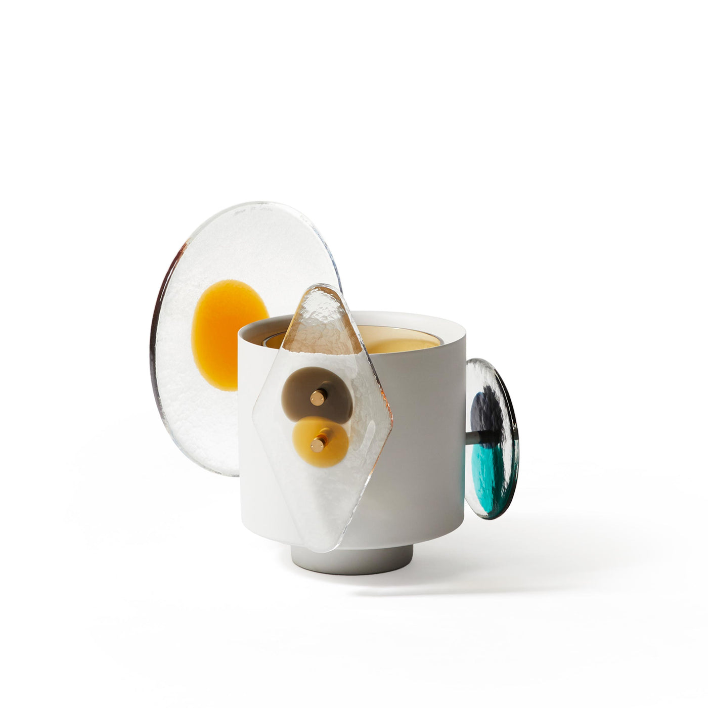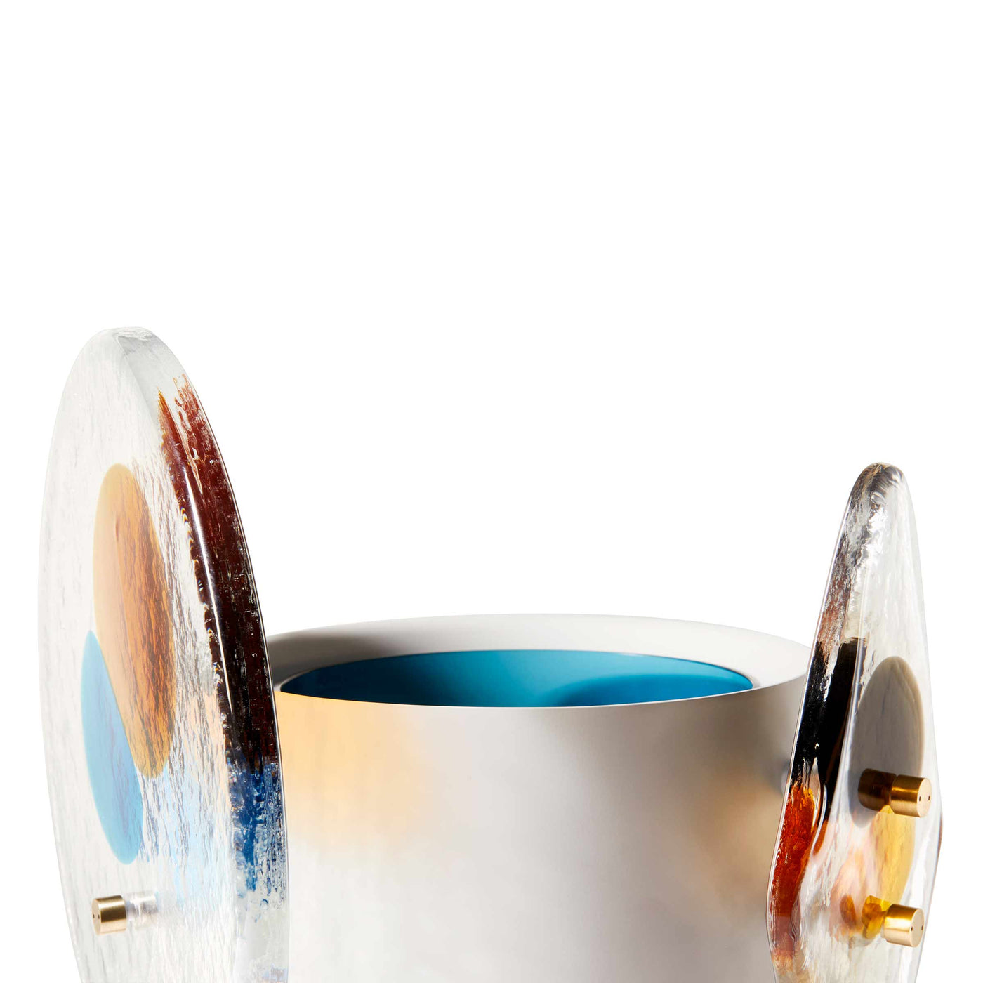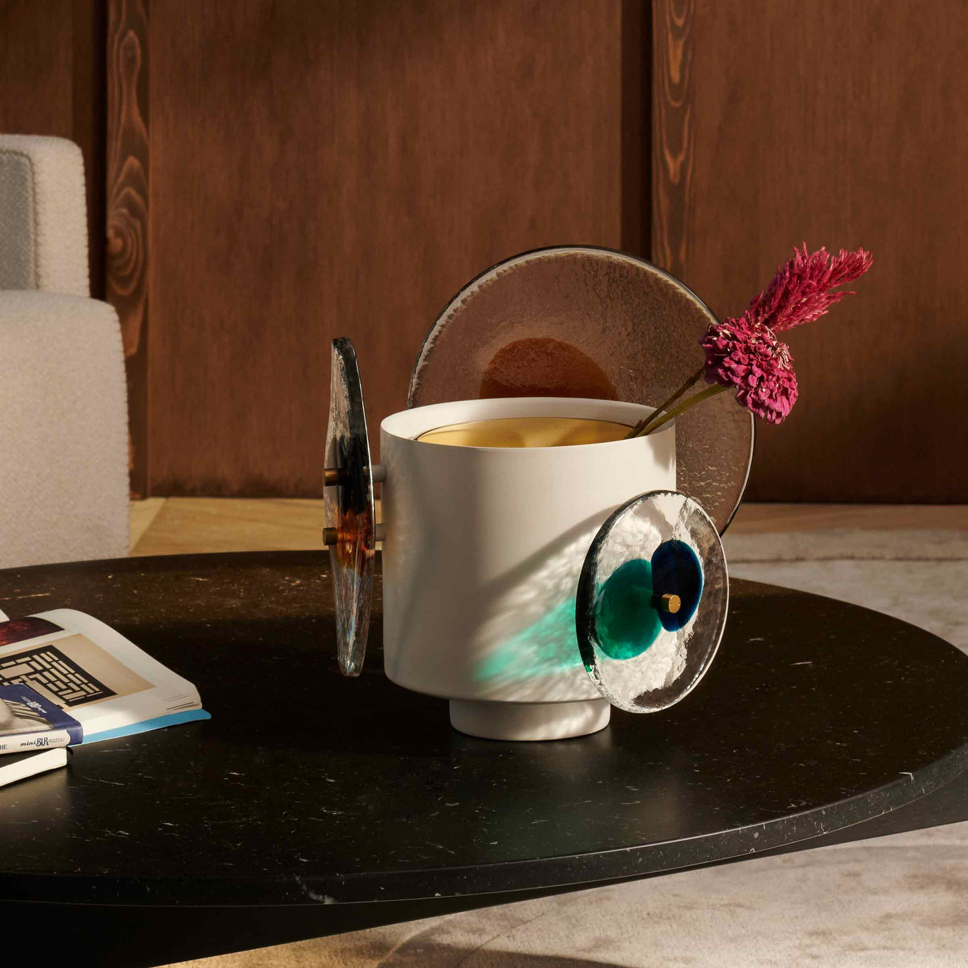 L'intérieur peut inclure un insert optionnel constitué d'un vase en verre soufflé de couleur ambre ou bleu horizon pour donner à l'objet un bain de couleur supplémentaire et permettre de le remplir d'eau lorsqu'il contient des fleurs.