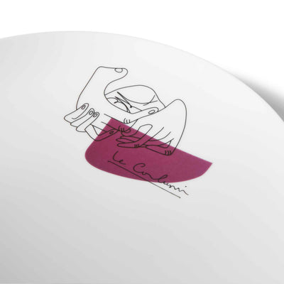 La collection Service Prunier comprend une assiette, un plat à soupe, une assiette à dessert et une tasse à café avec soucoupe, et est fabriquée en porcelaine blanche, comme le modèle, avec le design original de Le Corbusier appliqué à la main.