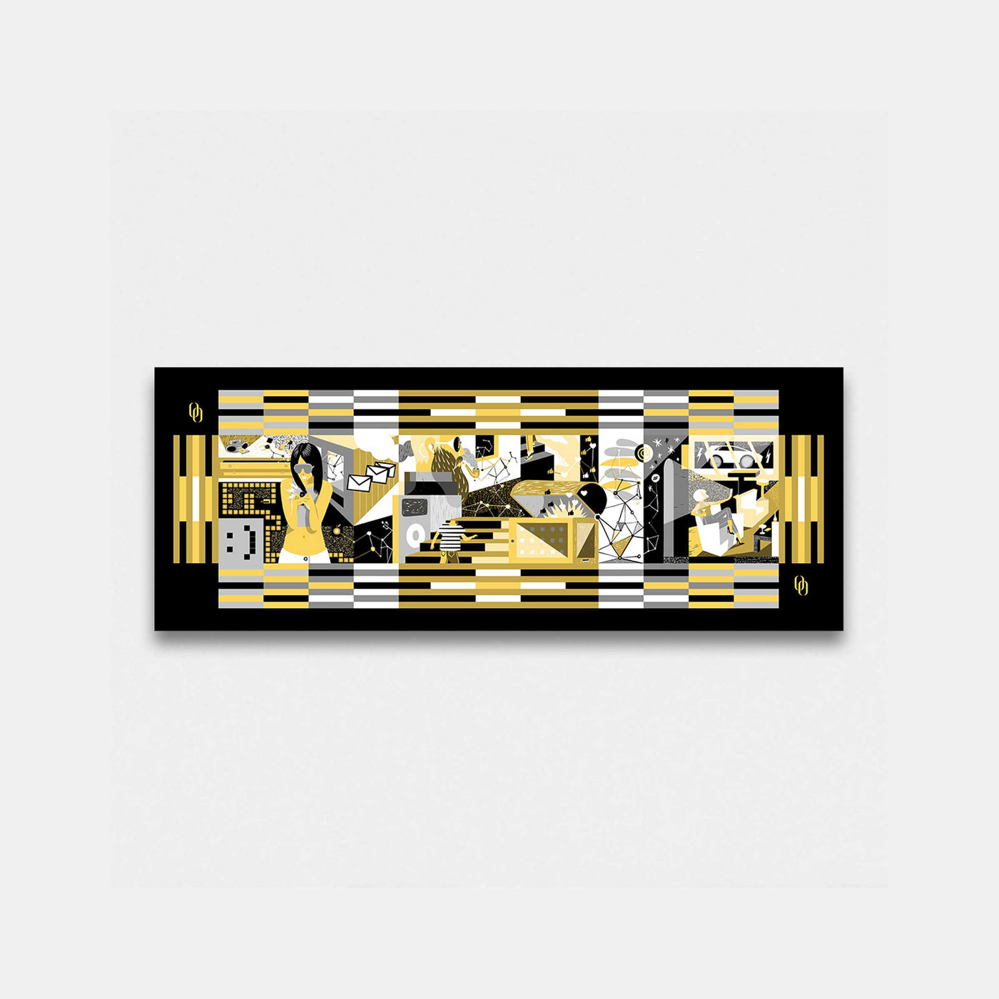 Cette étole représente une série de géométries artistiques qui racontent les changements épiques survenus entre 1940 et le nouveau millénaire, à travers une série d'images et de fragments iconiques. Des tomes d'encyclopédies aux sites web, des polaroïds aux images mondiales sur les réseaux sociaux.