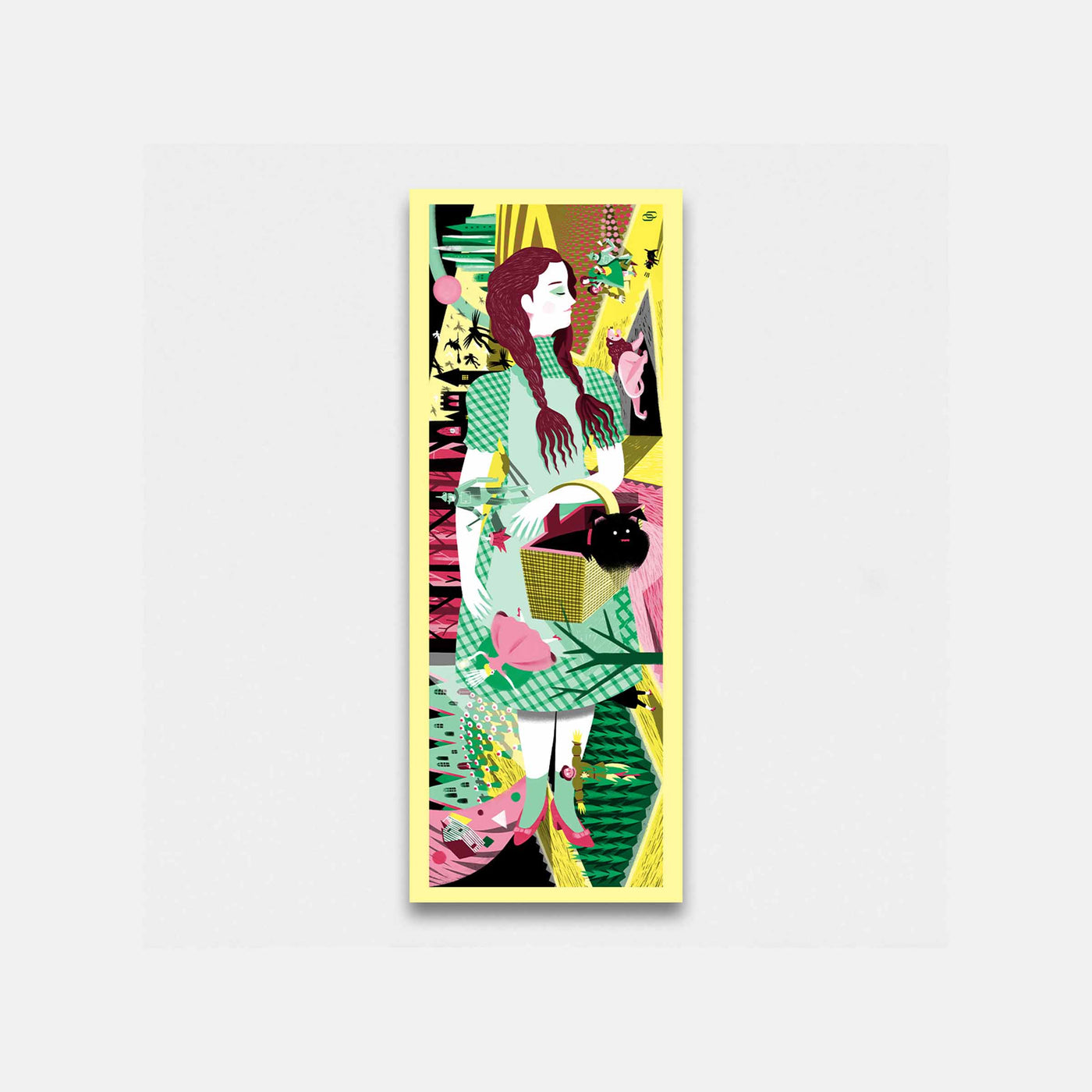 Cette étole représente une jeune fille aux chaussures rouges dans un labyrinthe jaune, représentant clairement Dorothy du Magicien d'Oz.