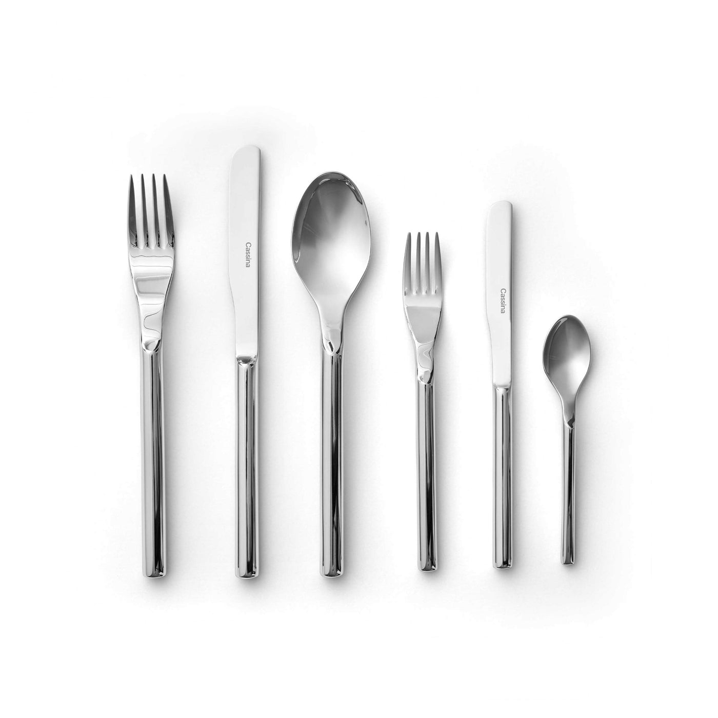 Les manches cylindriques en argent renforcent le luxe sensuel de l'argent, tandis que les lames des couteaux extrêmement tranchants et les fourchettes et cuillères parfaitement forgées et estampillées offrent une fonctionnalité exquise.