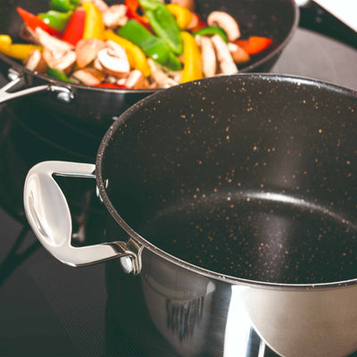 L'élégance rencontre la fonctionnalité. Revêtement interne en micro-pierre pour une cuisine naturelle et saine, sans graisse, qui permet d'exalter la véritable saveur.