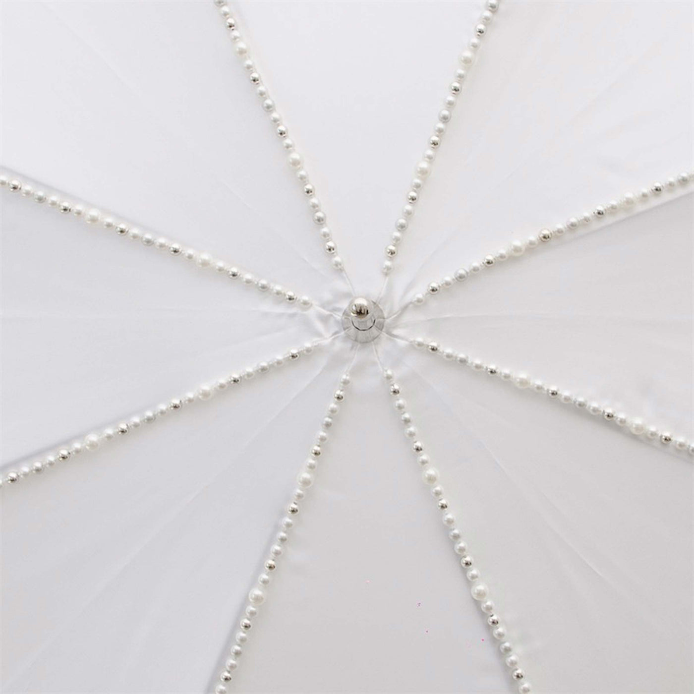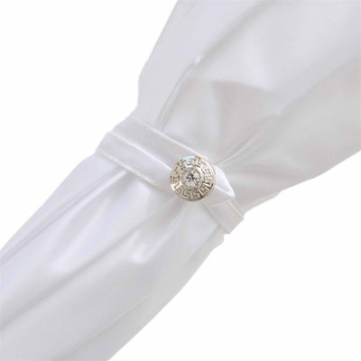 Ce parasol élégant s'ouvre manuellement et est orné d'une poignée en laiton sertie de bijoux. Cet accessoire de luxe ajoutera une touche de charme à votre journée spéciale.