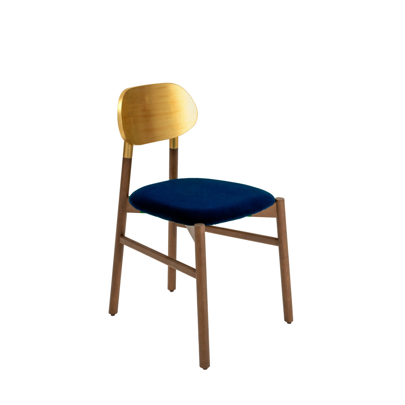 Fabriquée en bois de hêtre teinté pour un effet noyer Canaletto et dotée d'un dossier recouvert de feuille d'or ainsi que d'un siège rembourré revêtu de velours italien fin disponible en plusieurs couleurs, les jambes allongées de cette chaise s'inspirent du bokken japonais traditionnel utilisé dans l'entraînement aux arts martiaux.