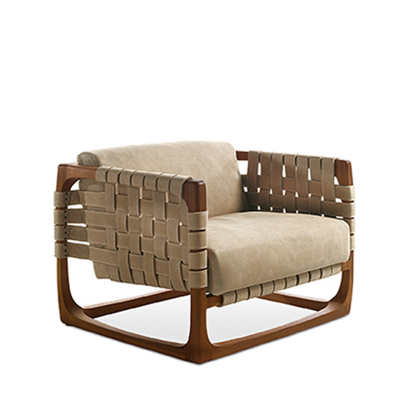 Parfait pour les espaces de vie élégants et les espaces contractuels, ce fauteuil est composé d'une structure en bois massif entièrement tourné, assemblé et poncé à la main. L'assise, le dossier et les accoudoirs présentent des lanières de cuir entrelacées, et les coussins sont recouverts de cuir Utha.