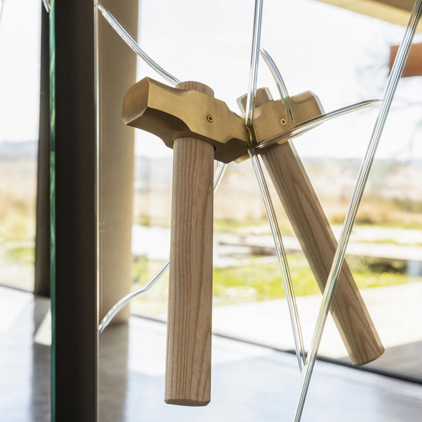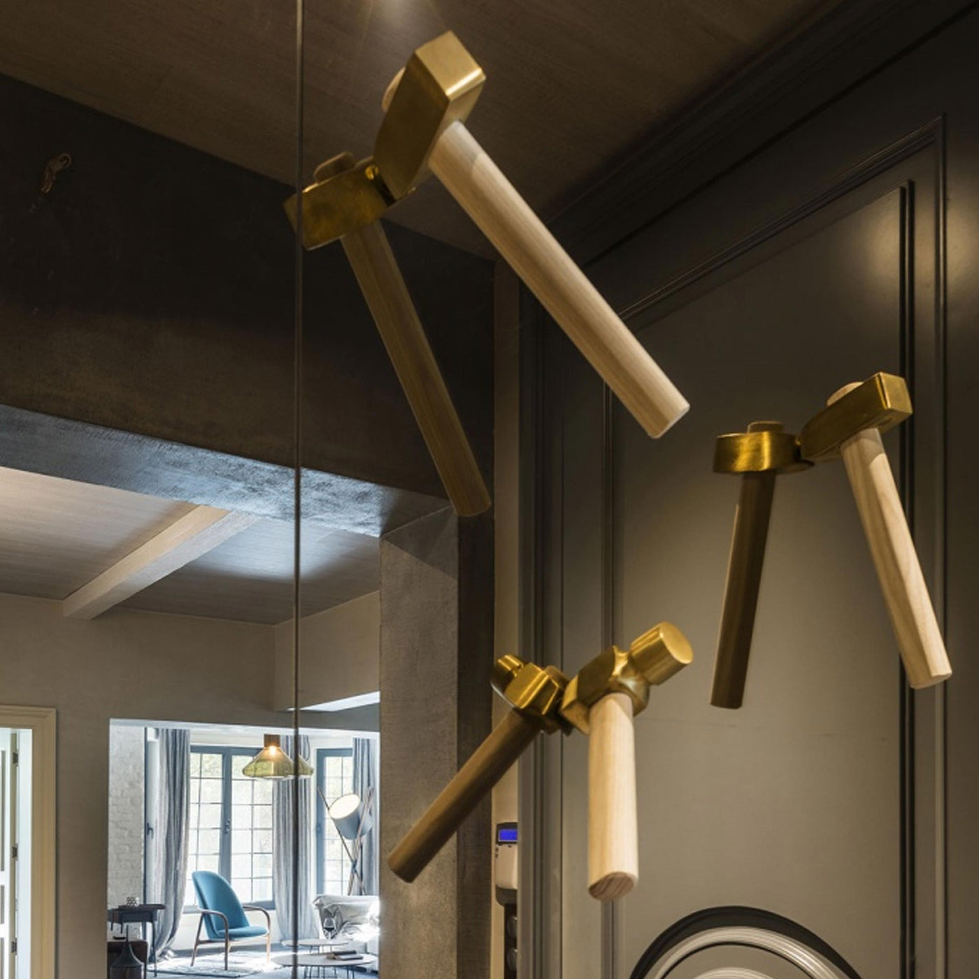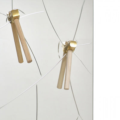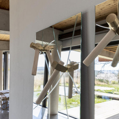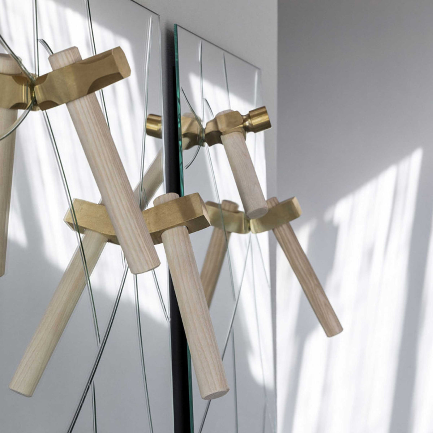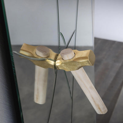 Parfait pour ajouter du caractère aux entrées, ce miroir amusant présente de petits porte-manteaux en forme de marteau avec une poignée en frêne d'olive et une tête en laiton coulé.