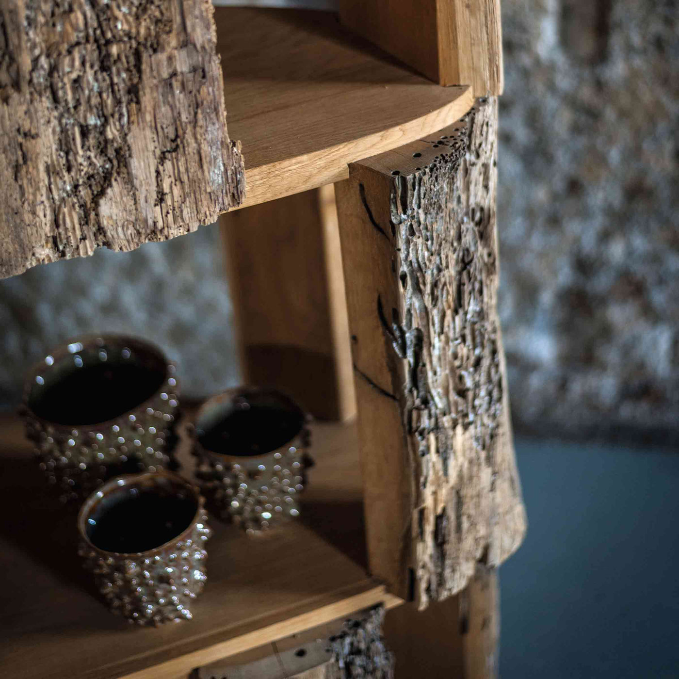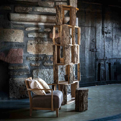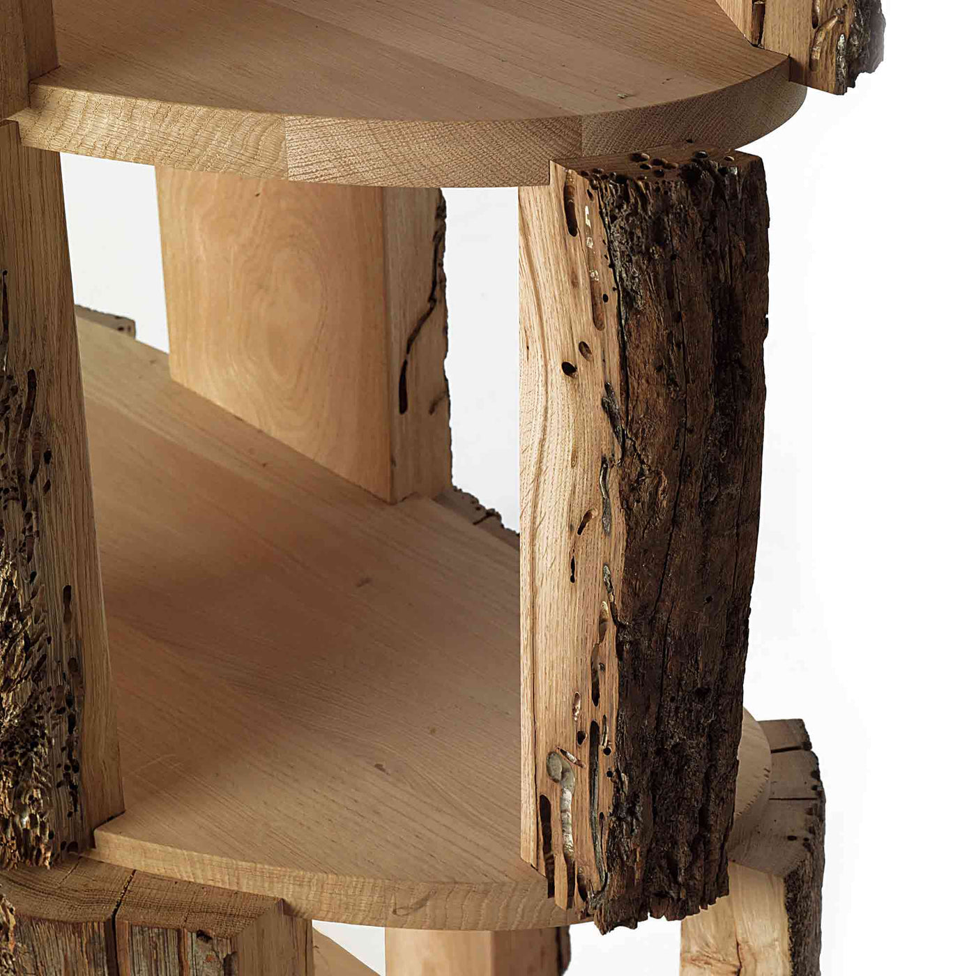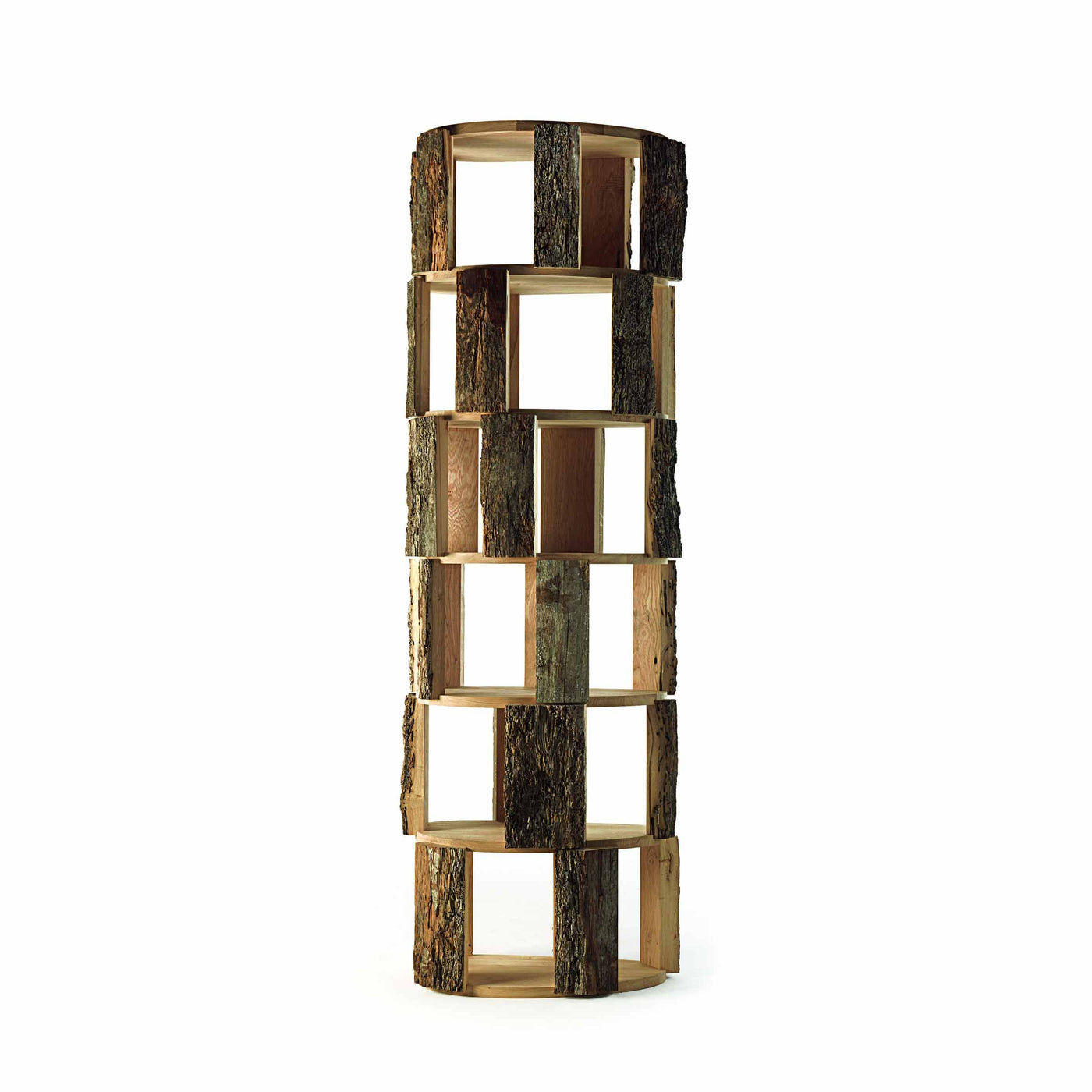 Cette bibliothèque particulière en bois de briccola se caractérise par un développement linéaire en colonnes avec différents niveaux qui laissent place à des compartiments de rangement bordés par des portions de tronc avec écorce.