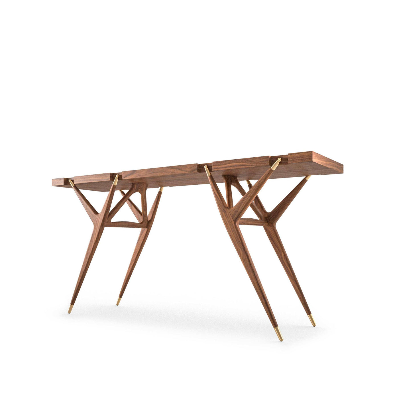L'idée de cette console, conçue par Ico Parisi en 1947 pour un client privé, est née de quelques traits tracés sur une feuille de papier : une ligne horizontale et deux lignes obliques pour définir une structure aux proportions presque parfaites et à l'apparence organique. Cassina a respecté et sublimé le cœur de ce projet en alliant technologie et savoir-faire artisanal, typique de l'atelier de menuiserie de l'entreprise ; le résultat est une console en bois massif raffinée ornée de détails métalliques qui s'adapte à toutes les pièces de la maison.