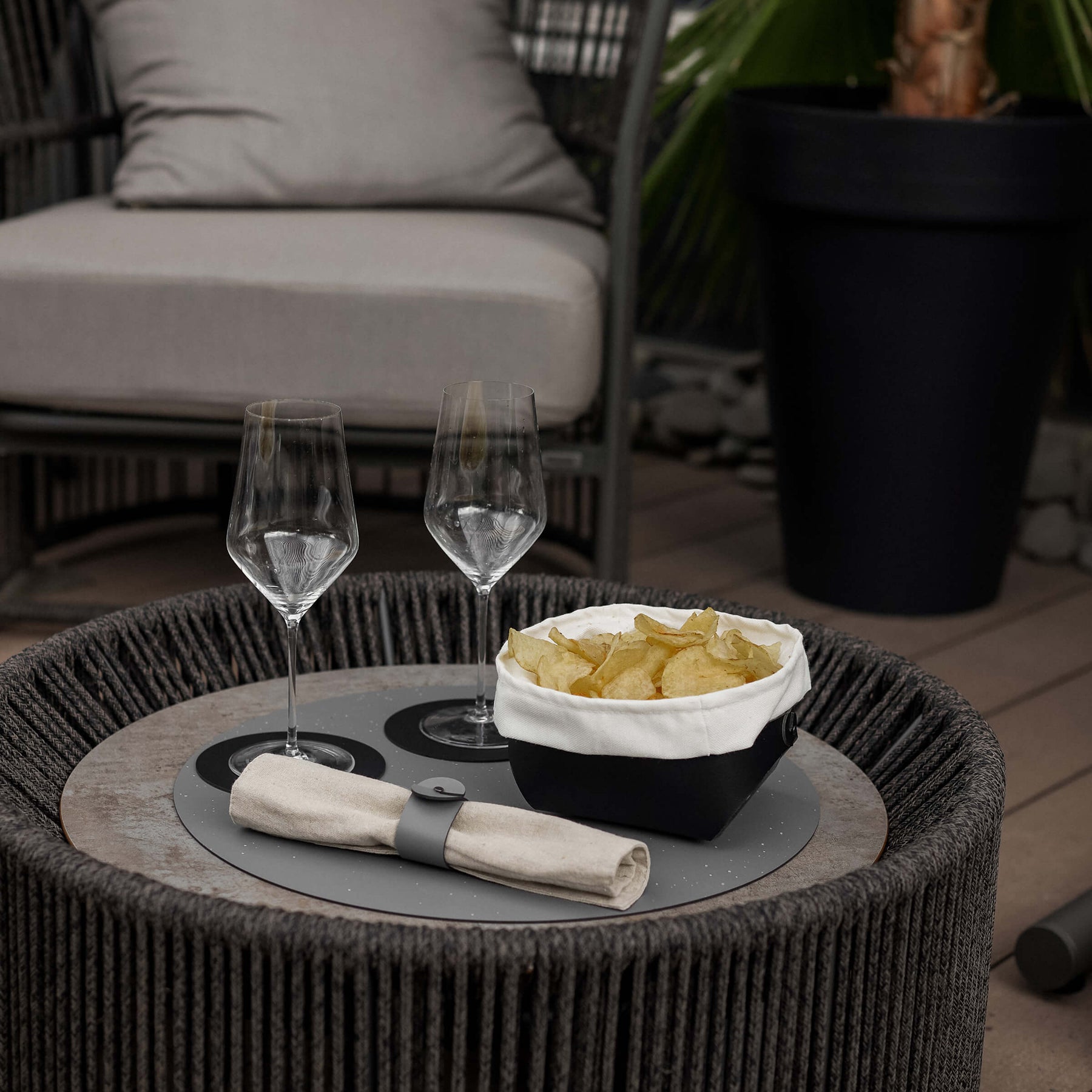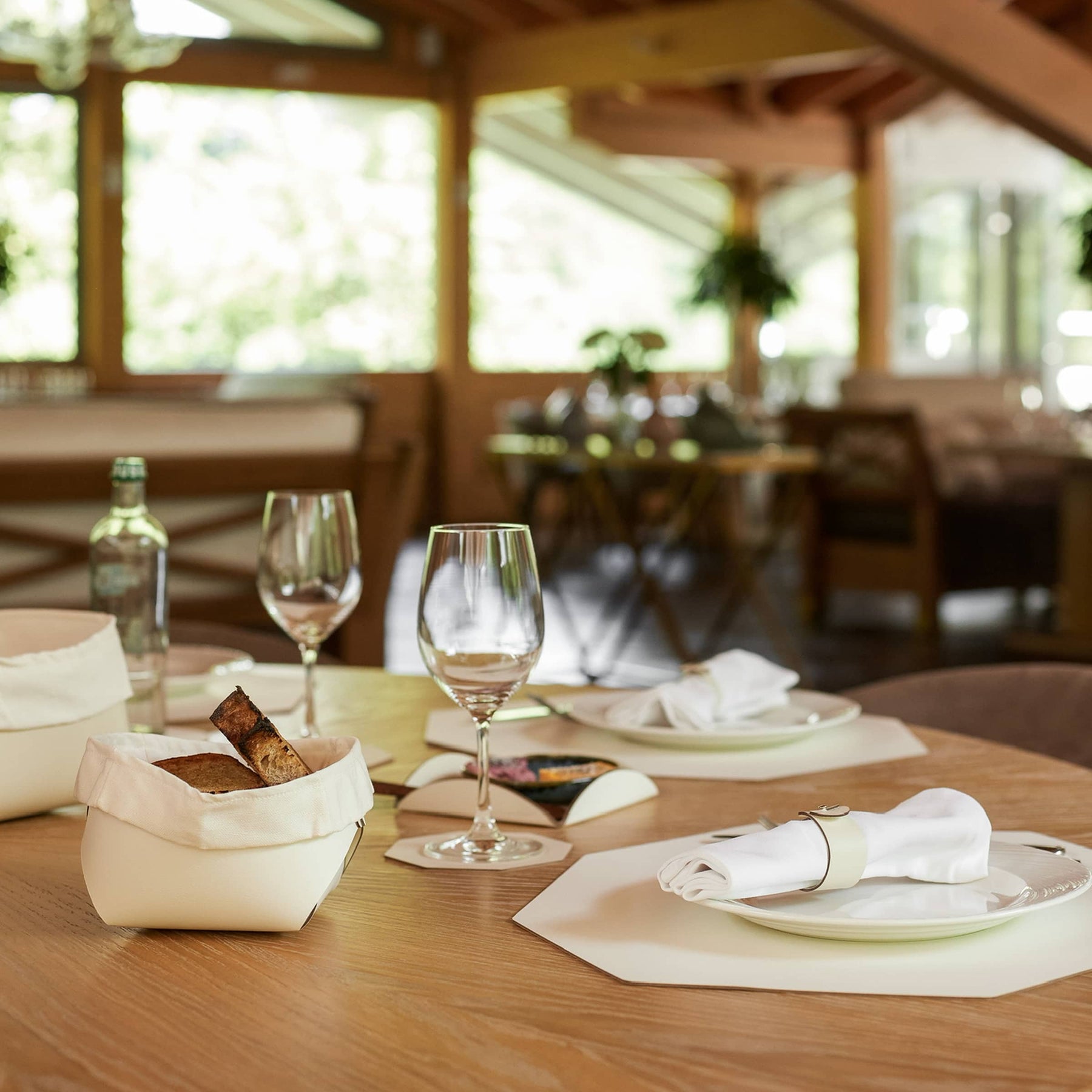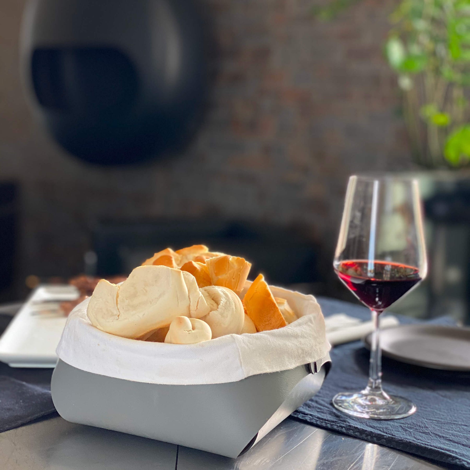 Nella cultura italiana, il pane è un elemento chiave della mise en place, presentato magnificamente in questo cestino per essere al centro dell'attenzione.