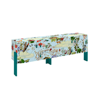 This laminate cabinet comes in a digitally printed white, black and red striped pattern or a floral print. Interior in black laminate and drawers that feature a soft-close mechanism. The legs come in a black or teal lacquered finish or in a Canaletto walnut veneer. For indoor use only.