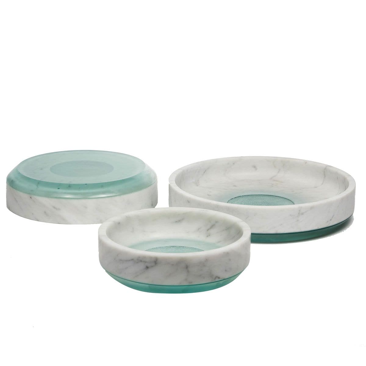 This piece is in a combination of Carrara marble and glass, created on a lathe. The stone becomes progressively thinner towards the centre until it disappears, giving the glass the possibility to emerge, revealing the light that penetrates through the transparency of the glass.