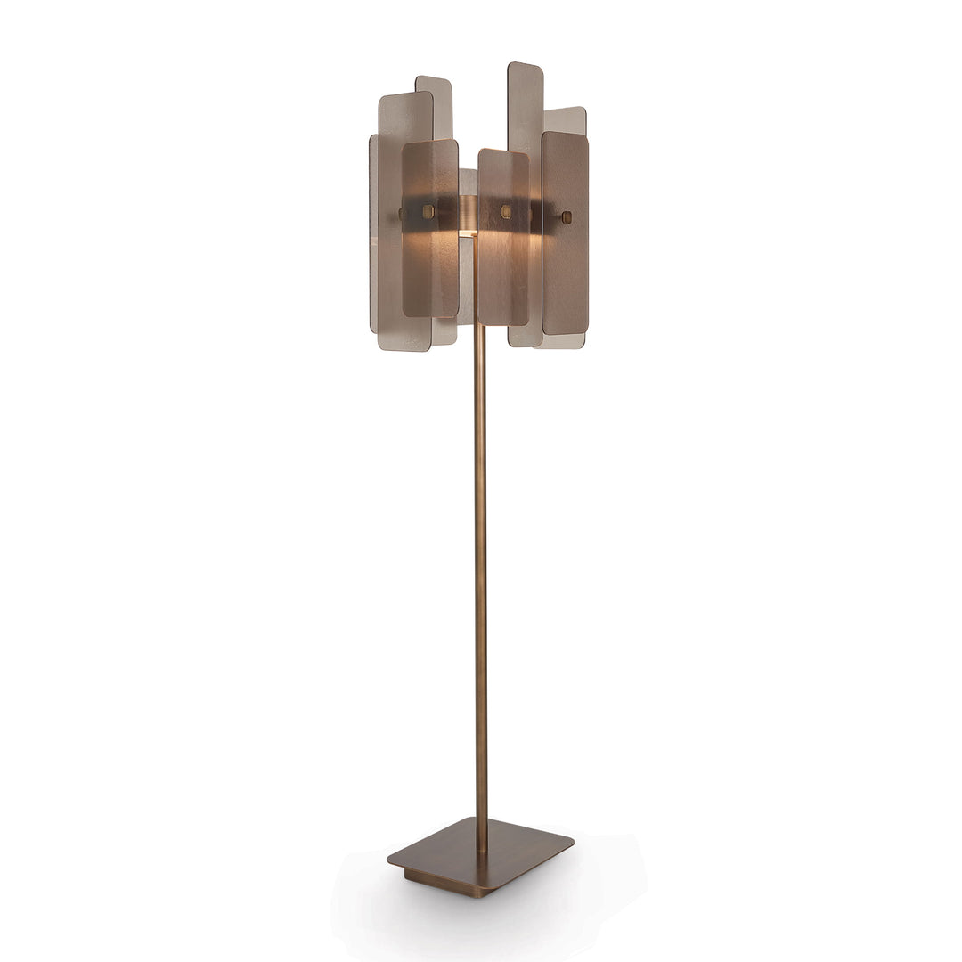 Lamp with metal structure in antique bronze or champagne finish—decorative glasses in three shades of bronze or three shades of smoked glass.