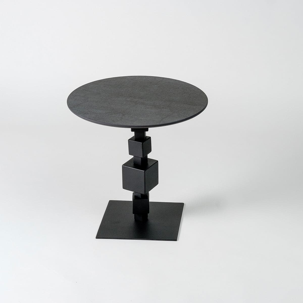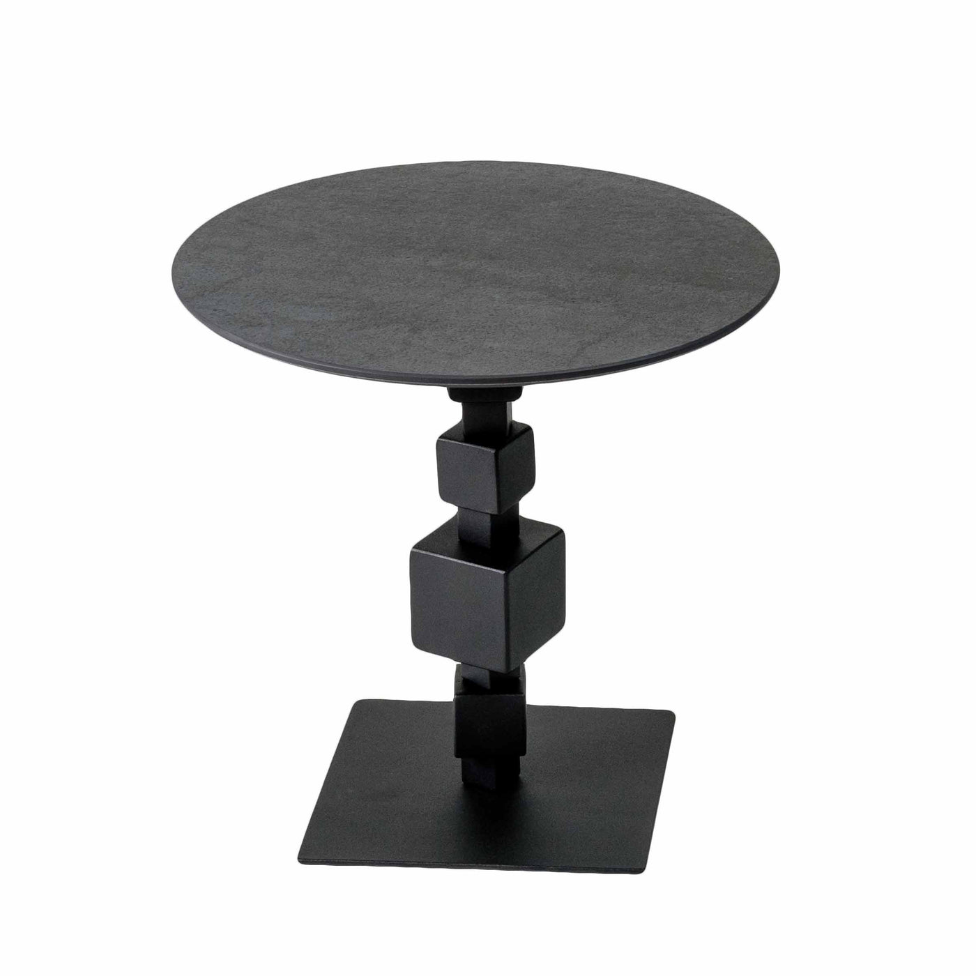 This accent table features a handmade metal structure finished in epoxy dust with a matte black finish, and a round tabletop as a contrast to the square lines and corners of its base and the various cube shapes decorating its central leg.