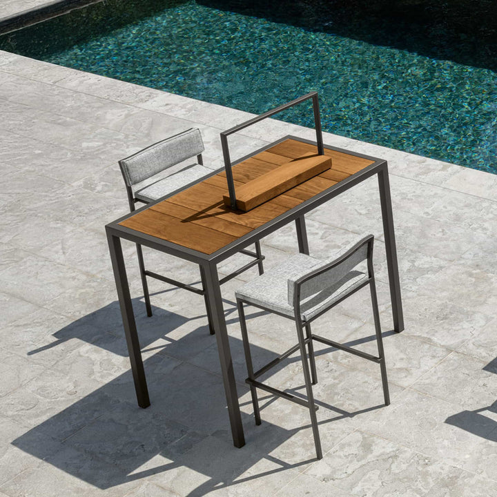 Elegant and stackable outdoor wood and steel bar table CASILDA was designed by Ramón Esteve for Talenti and was handcrafted in Italy.