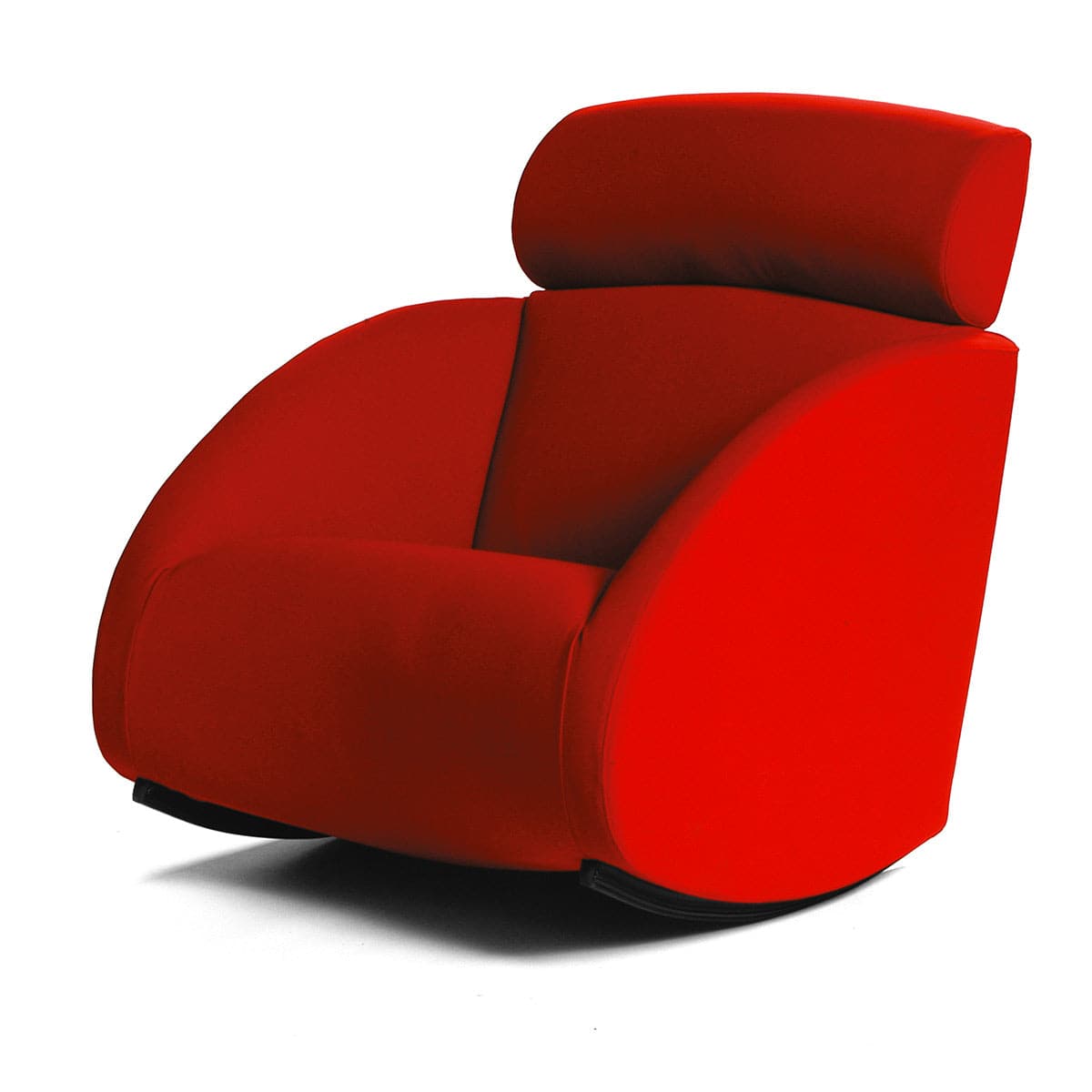 Rocking armchair with adjustable headrest. Internal structure in steel tubing. Filler in flexible polyurethane, cold-processed without CFC. The headrest is adjustable in height and inclination.